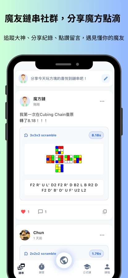Cubing Chain 是一款專為全球魔術方塊愛好者打造的社群平台與專業計時工具。無論你是剛學會基礎解法的新手,還是追求極致速度的魔方大神,這裡都有屬於你的舞台! 【核心功能特色】 專業級計時器 支援 WCA 各大項目打亂與公式。讓你專注於每一次的極速復原。詳細的數據統計與 PR 紀錄,見證你的進步軌跡。 多人連線對戰 覺得一個人練太孤單?開啟「全球排位賽」與實力相當的玩家一較高下,提升段位;或是建立「自訂房間」邀請好友同樂;更支援本機同屏對戰,隨時隨地來一場魔術方快速解對決! 專屬魔友鏈串 (Feed) 打造專屬你的魔方動態牆!一鍵分享你的神級打亂與測速成績,發佈照片與心得。追蹤全球大神,為精彩的復原按讚留言,結交志同道合的魔友。 公式紀錄系統 內建結構化的公式庫,幫助你輕鬆記錄與學習新公式。搭配分步驟指引,讓你的學習事半功倍,不再死背公式。 立即下載 Cubing Chain,連結全球魔友,轉動你的極限!