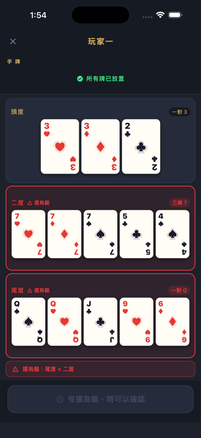 港式十三張,手機開枱,隨時隨地! 唔需要紙牌,直接喺手機上打十三張。兩個人各自執好十三張牌,分成頭度、二度、尾度,排好陣勢再睇牌比大細。 【玩法】 洗牌、發牌、排牌,一條龍喺 app 入面完成。排好之後一按確認,即刻睇到邊度贏、邊度輸,勝負清清楚楚 —— 正宗港式規則,唔會計錯。 注意擺烏龍隨時出現——App 會即時提醒你! 【功能】 • 虛擬洗牌發牌,全程無紙牌 • 頭、二、尾三度分開比較 • 自動判定勝負,防止計錯數 • 遊玩紀錄,睇返每局結果 • 支援 iPhone 同 iPad 【現時版本】 支援雙人對戰。多人版本敬請期待。