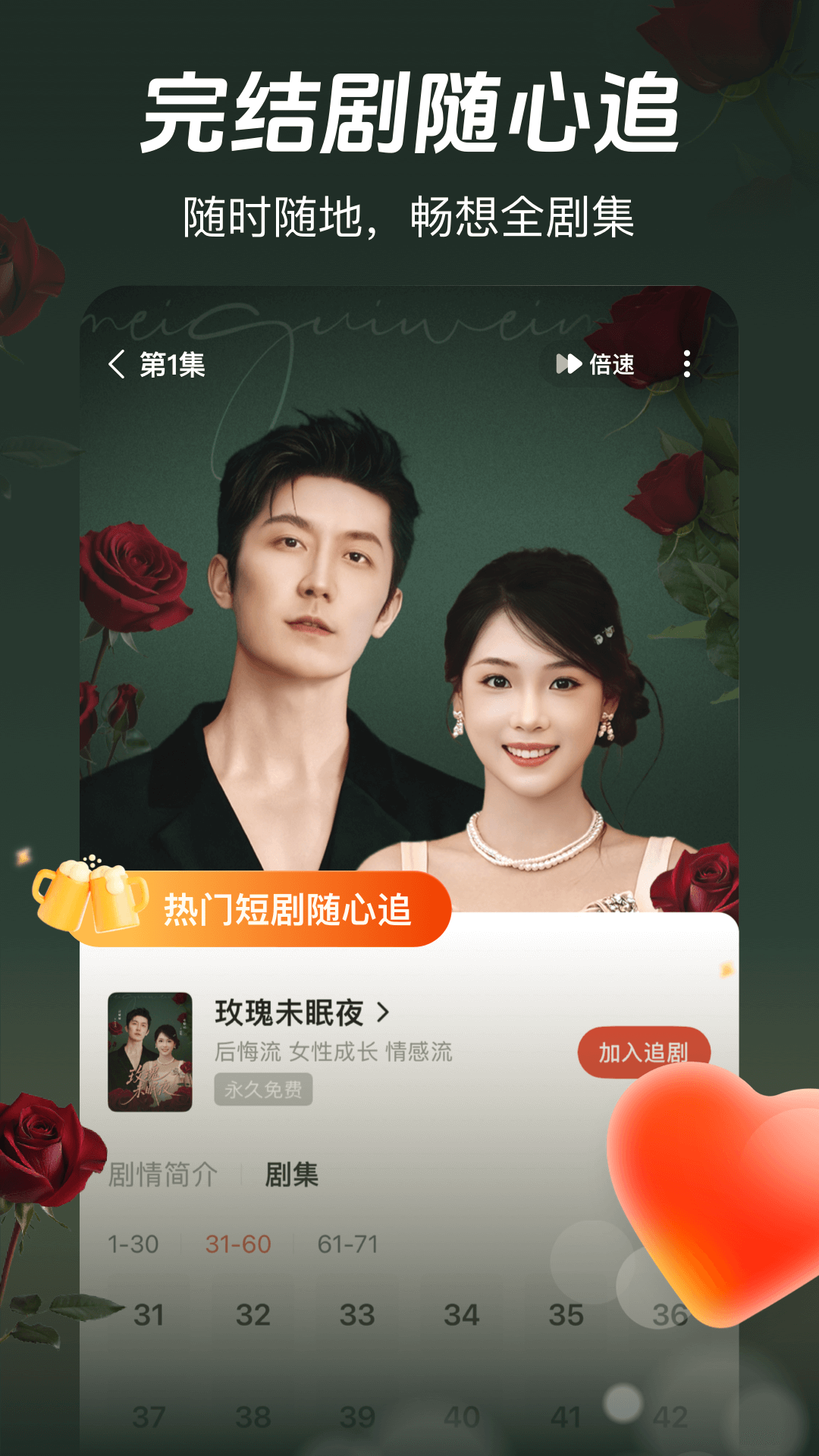 【抖音旗下】<br>红果短剧是抖音集团推出的免费看剧产品,致力于为用户提供海量免费优质短剧。免费好剧,尽在红果!<br>【产品形态】<br>产品定位:以提供海量免费优质短剧资源为主,同时包含电影、电视剧、小说、有声书、漫画等多元内容,满足不同用户的多样化娱乐需求<br>- 海量免费短剧:涵盖都市热血、甜宠言情、职场婚恋、逆袭反转、玄幻仙侠等多种类型,免费好剧,尽在红果<br>- 多元影视娱乐:涵盖电影、电视剧、漫画等多种体裁,为用户提供多元化的免费娱乐选择<br>- 丰富小说听书:涵盖海量小说、有声书,丰富用户免费阅读及畅听体验,同IP内容多体裁随心选<br>【特色功能】<br>- 单列推荐:沉浸式上下滑找剧,个性化推荐找到你爱的短剧<br>- 剧场找剧:九宫格推荐,高效找剧,新剧、爆剧不错过<br>- 评论:边看边评论,与剧友一起讨论精彩情节<br>- 一键追剧:喜爱的短剧一键追剧,随时回访,好剧不错过<br>- 提前预约:待上架短剧提前预约,上线通知,及时观看<br>- 高效播控:任意选集、小窗播放及倍速功能,带你畅游短剧<br>- 金币福利:签到看剧攒金币,边看边赚钱<br>【用户好评】<br>- 短剧现在很流行,很多平台都要付费看全集,红果却可以全部免费看,真的太给力了,省了好多钱!<br>- 红果的短剧内容真的很全,想看的剧基本都能找到,而且现在好看的剧也越来越多了,很多剧还是独家首发的,一上线就能免费看全集,真的很惊喜!<br>【温馨提示】<br>--如果遇到任何问题,请尝试打开:"红果短剧-我的-反馈与帮助"描述和输入问题详情,我们会跟进处理并解决。<br>--不断迭代和优化产品是我们的始终坚持,我们将会不断优化体验为用户创造最好的观剧感受。