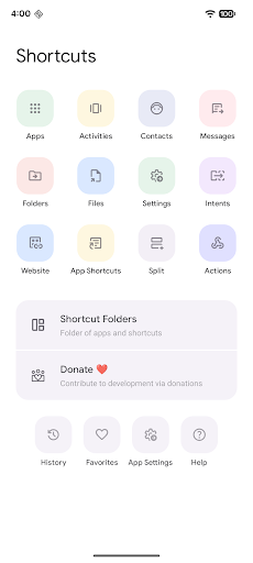 这个应用程式可以在Android主萤幕上建立您想要从Android取得的任何功能的捷径。<br><br>只需选择功能,然后单击CREATE即可创建快捷方式。而已!<br>很简单吧?<br><br>您也可以使用此应用程序从已安装的应用程序启动活动。<br>应用程序和活动:创建已安装的应用程序和活动的快捷方式。<br><br>文件夹和文件:从内部存储创建文件夹和文件的快捷方式。<br><br>意图:与默认应用程序一起创建android系统意图的快捷方式。<br><br>快速设置:创建快捷方式以快速更改系统设置。<br><br>网站:您最喜欢的网站的快捷方式。<br><br>用户请求的:用户请求的功能。<br><br>#Custom#:这是一项额外的新颖功能,可从已安装的应用程序获取快捷方式并在创建前在此应用程序中进行编辑。<br><br>与我联系:将您的建议邮寄给我的快捷方式:)<br><br>快捷方式预览:选择活动应用程序后,将在创建前向您显示快捷方式的预览。在这里您还可以重命名快捷方式名称。您还可以将快捷方式添加到收藏夹。<br><br>历史记录:您可以在此处查看您创建的快捷方式列表。<br><br>最喜欢的:在这里您可以检查自己喜欢的快捷方式的列表。<br><br>如果您想在此应用程序中添加任何功能,请在Rkamewar1111@gmail.com上将您的回复和反馈发送给我(不要忘记在主题中添加应用程序名称)<br><br>特别感谢MaterialSearchView(感谢MiguelCatalan!:)提供了带有简单UI且实现简单的免费searchview。这是我为此使用的库的链接:<br><br>https://github.com/MiguelCatalan/MaterialSearchView
