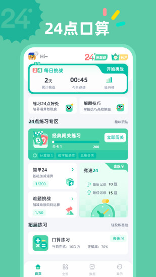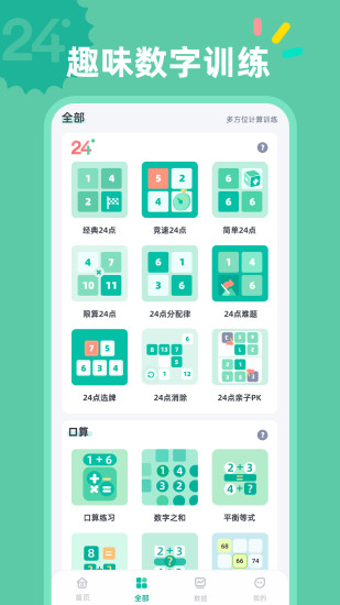 1.24点口算是一款益智软件,既有趣味的24点,形式多样的口算玩法,还有烧脑的数字逻辑推理,提升数字的敏感度和数学的趣味性。 2.三大模块,21项趣味玩法,提供多方位趣味数字训练 【24点】包含9种24点玩法,其中经典24点是最原始的24点玩法,另外还有竞速24点、简单24点、限算24点、24点分配率、24点难题、24点选牌、24点消除、24点亲子PK这8种拓展玩法,各有倾向性,充分展示24点的趣味性和复杂性; 【口算】包含口算练习在内,可以根据自己想要的数字范围和运算法则进行选择练习,精准训练自己的口算能力;还有数字之和、平衡等式、拆数达人、算术达人、三阶幻方这5种趣味数字模式,提供更加复杂的基础计算; 【数字逻辑】包含数字华容道、数方、数织、纵横算式、九宫数独、找规律这6种逻辑推理玩法,锻炼逻辑思维的同时也能增加数字反应的敏感性; 3.打印功能,可以对24点、口算练习的题目进行打印,方便喜欢在纸面上玩24点、练习口算的人群; 4.适合人群:不分年龄,男女老少,只要是喜欢各种数字解谜游戏、需要打发时间、多人聚会、希望提高自己计算能力的人都可以玩。 工作学习之余,可以来这里放松一下,一起比拼计算能力和反应能力,缓解一下压力。