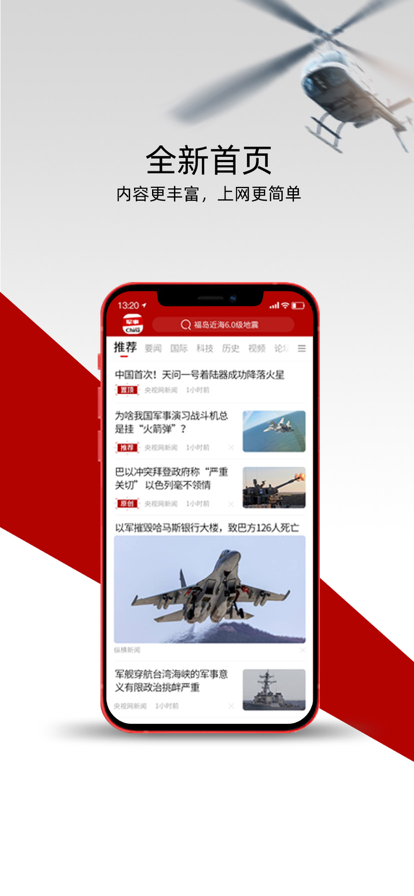 中华军事,最新军事资讯和权威军事原创。 中华军事是一款基于智能个性化推荐、实时热门推送,同时,集合各路军事大咖原创的权威军事资讯APP。 【推荐】智能推荐,为您量身打造属于您的军事资讯平台。 【热点】新鲜、热门的军事话题、资讯,实时展现在您的面前。 【原创】专业权威的原创军事文章,让您尽情翻阅浏览。 【图集】生动的图片展示最鲜活的军事故事,以图话事。 了解过去、分析现在、展望未来,让您更直观、更全面地了解国内与国际军事军情。
