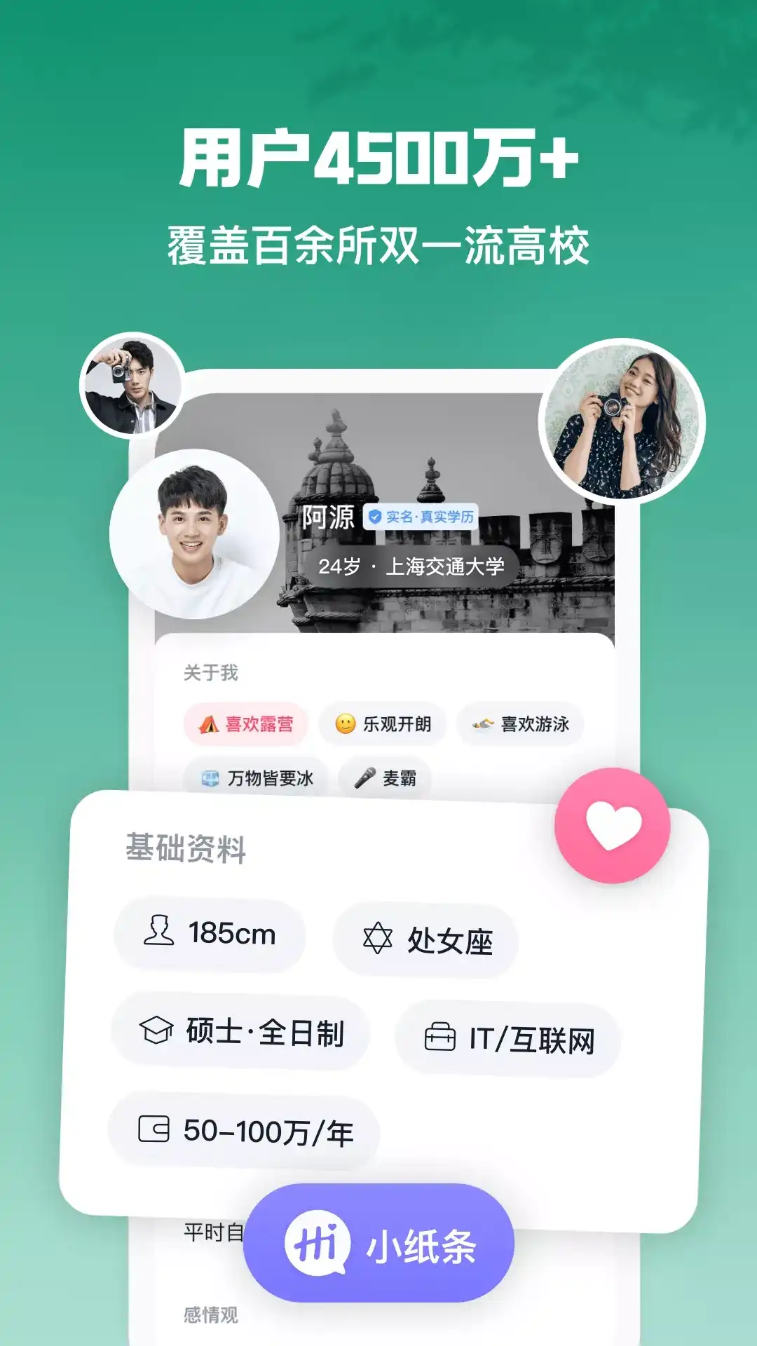 一伴-相亲交友精选品牌。 希望你爱的人,正悄悄爱着你。 汇聚全国优质单身用户,八年来始终秉持真诚、务实、认真的态度为用户提供优质服务,做国人信赖的婚恋平台。 APP上线7天就有用户牵手成功,现每周见证数千对用户在平台上脱单。高净值用户较多,一伴也是国内多个电视台相亲节目的报名通道。 为营造良好的交友环境,一伴实行实名制注册机制,所有用户都需要进行信息审核,并通过后才能使用。平台还拥有学历认证、职业认证、资产认证、形象视频认证等认证系统,杜绝虚假信息、广告和不良用户的存在,为真诚的寻找另一半的单身男女提供一个能够真挚相爱的婚恋平台。 【产品亮点】 1、小纸条聊天——新颖的小纸条聊天方式 找到心动的人时候,可以发起小纸条给对方进行聊天。就像学生时代和喜欢的人传小纸条一样,清新又有趣,使得聊天开场白不会尬。 2、动态发布——同城异性的朋友圈 生活圈子太小,认识不到另一半?那么这个宝藏功能你要收好了,可以查看你身边的朋友圈,结识兴趣爱好、恋爱观和自己相近的Ta。 3、真实信息——只和认真的人谈恋爱 为打造真诚、真实、善良的交友环境,平台实行严格的信息审核制度,拥有学历、职业、资产、形象视频认证等认证系统,杜绝虚假信息、广告和不良用户的存在。 4、高效匹配——系统会高效帮你匹配到和你爱好相近的人 当你的资料完善后,系统会根据你的条件、爱好、恋爱观等特征进行匹配,匹配到和你属性相近的人,能帮助你在共同爱好里找到适合的那个Ta, 5、三行情书——表达对Ta的感情 每一封情书,都会有一段故事。你可以感受别人的爱情故事,也可以留下你对最重要的人的感情。 【注意】:本应用“禁止未成年人注册下载使用” 【用户评论】 “以前用过很多款交友软件,却没有找到一个真正合适合自己的人。很感谢一伴这个平台,让我遇到了一个非常心仪女孩,很巧的是她和我竟然是同一所大学毕业的,现在已经是我的女朋友了,准备国庆的时候和她一起再回大学看看。希望有更多人和我一样幸运,能通过这个平台找到自己的另一半” —李强 "在知乎上了解到了这个产品,看到很多人说靠谱,就抱着试试的心态注册了,在平台上主动搭讪了一个心仪的小姐姐,和她聊了几次后,发现我们有很多同样兴趣的爱好,都喜欢看《海贼王》《斗罗大陆》《秦时明月》喜欢下象棋,所以每次聊天都会有特别多的话题。不久后来我鼓起勇气邀请她见了面,结果成了。哈哈哈,太开心了。”—赵丹 “我是好闺蜜推荐来这个平台的,因为她也在这里找到了好的归宿,现在已经是美满婚姻了,在她的多次“好意”提示下,我来到了这个平台。刚注册的时候需要填写很多资料感觉比较麻烦,但信息认证后感觉里面的氛围的确很好,聊了一个比较有好感的男生,见过一次面了,相处下来也很舒服。挺感谢闺蜜的推荐的。”—蒋素素