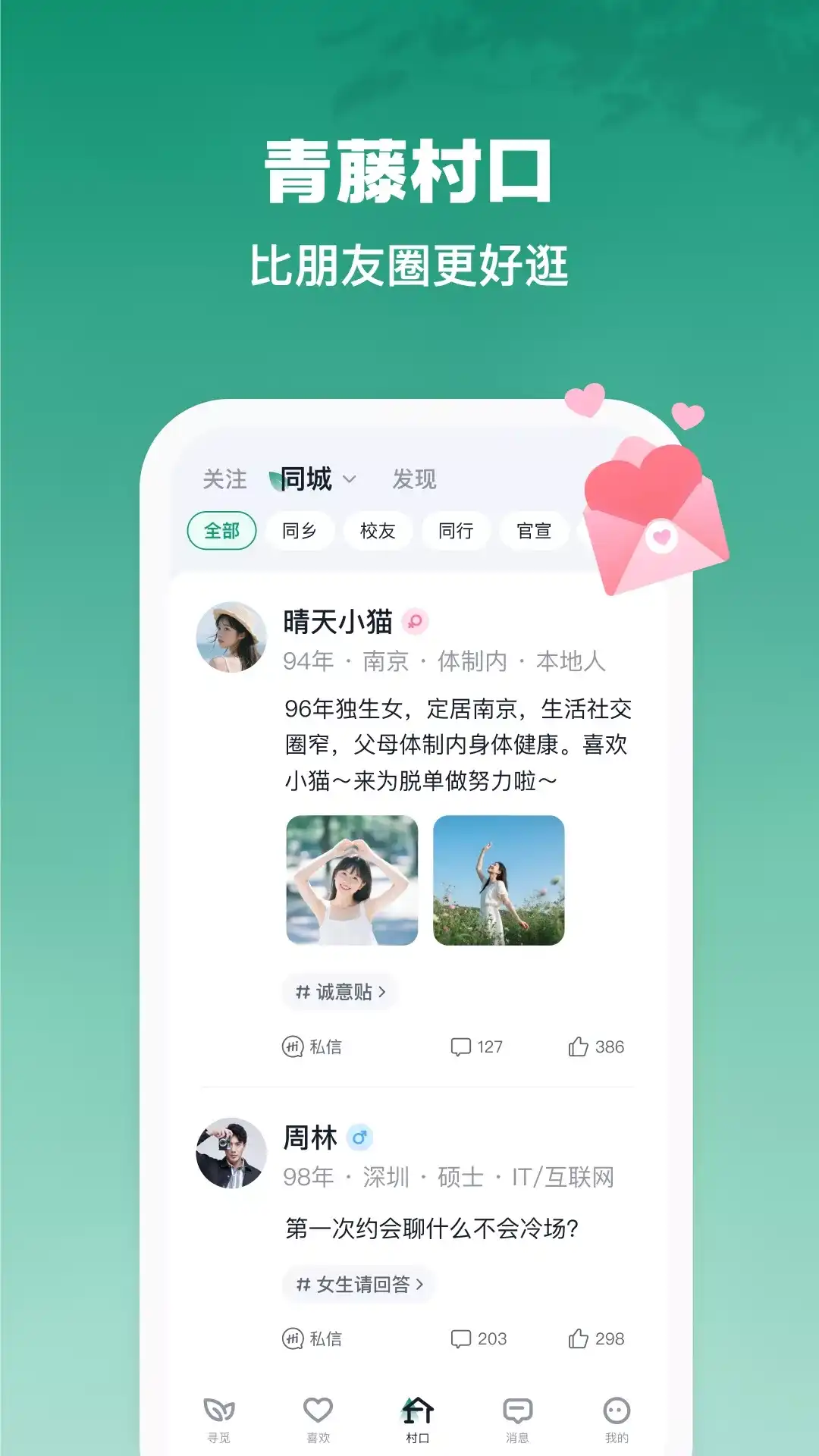 真诚/可靠/温暖/走心 起源于武大、华科,获央媒推荐的脱单交友平台。上线以来,已帮助千万青年建立社交连接,数十万年轻人在此牵手成功收获爱情。我们相信:不愿将就的你,值得遇见同样优秀的ta。交际圈窄、没有时间、受够了无效的网络社交,来真诚/可靠/温暖/走心的青藤之恋,开始一段高质量关系吧。 【身份学历认证,资料严审】 确保对面的TA真实可靠,我们认为必要的“门槛”是“真诚”的前提。 【每日精准推荐】 大厂青年、名校毕业生、斜杠青年、医生… 推荐符合你要求的异性,照片+文字+语音,个人资料丰富立体。 【双向喜欢才能开启聊天】 没有噪音和打扰,我们认为好的关系一定是一场“双向奔赴”。 【村口社区,安放灵魂】 在这里你的疑惑有人解答,你的表达有人倾听,成长这条路上,大家相伴而行。
