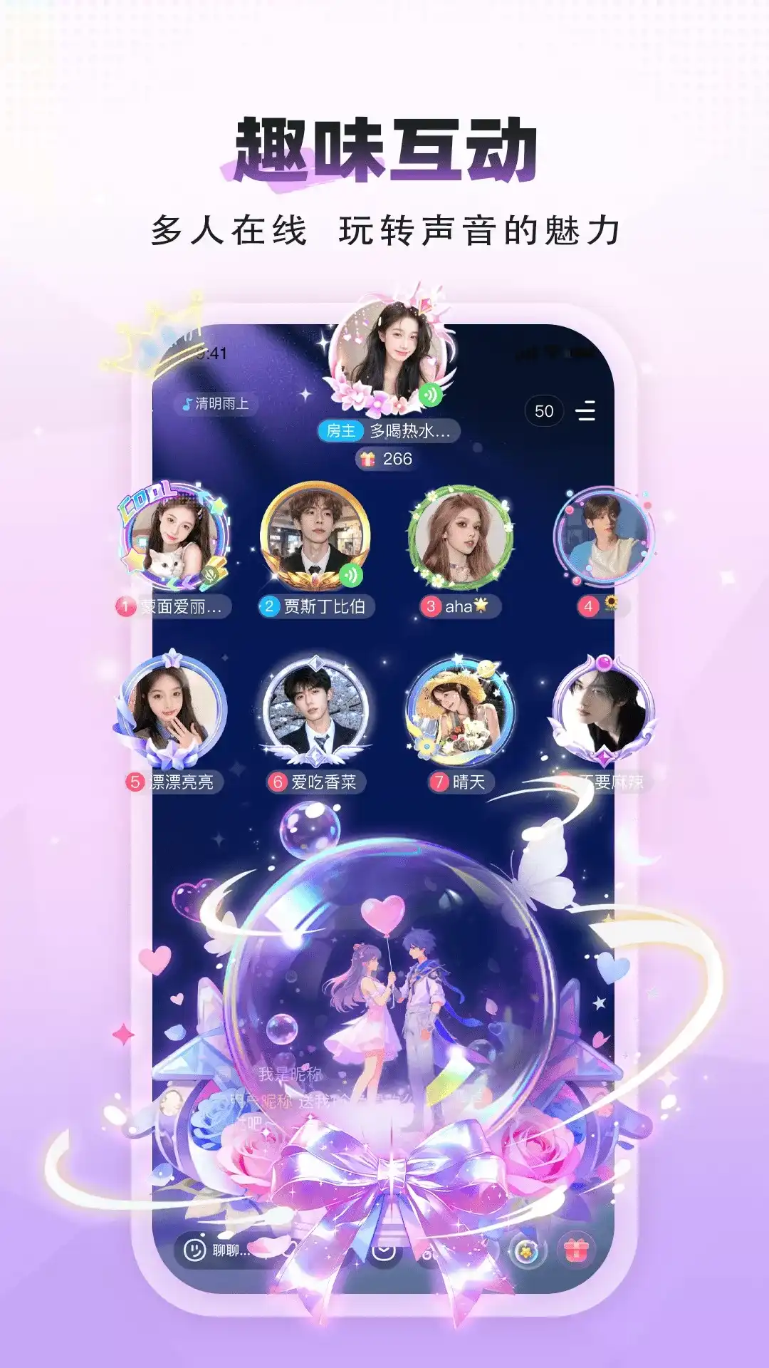 遇见你,陪伴你--语玩 功能介绍: 【遇见】: 无论是划卡片寻找同路人,还是发期待等待有缘人,扩列总是轻而易举。 【房间】: 支持创建多种房间类型,在普通房中找CP、聊琐事,不论是多人连麦兴趣畅聊还是高清同屏游戏开黑,总有人在陪你;在音乐房中同频相伴,天南海北的伙伴们因一张歌单相聚,在此刻听着同一首歌,或许是一种别样的浪漫;在陪伴房中,忽略距离的远近,和那个Ta尽享专属甜蜜,爱意如潮涌上心头。 【3D社区】:创建独特的3D虚拟形象,丰富的外观、妆容支持深度定制,在语玩元宇宙中和志同道合的友人们一起创造内容并尽情享受彼此的陪伴吧。 【秘密树洞】:简单高效,点击即可匹配语音通话,去接通命中注定的那通电话,开启未知的偶遇吧。 【动态】:让一切的美好有迹可循,在生活的琐碎中寻找自我。 更多功能如倾语酒吧、圈子、挚友、CP小屋、假面速配...这一切都等你来发现! 如您使用遇到问题,请在APP内反馈【语玩团队】 或发邮件给我们:yuwan@yuwantech.com 或通过公众号反馈给我们:yuwanapp1314