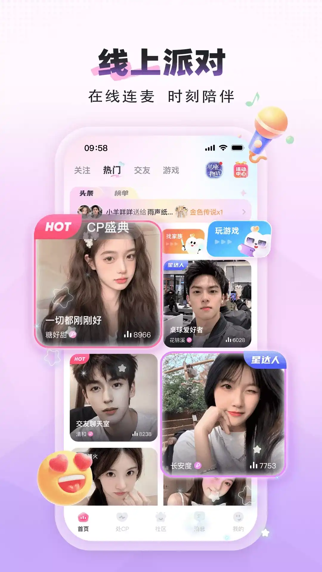 恋爱交友,从处CP开始 处CP是一款深受年轻人喜爱的社交APP,自动分配优质对象,在线组CP。 在处CP,找对象、找朋友、找人开黑,所有社交需求通通变得高效容易,无论你是声控、颜控,我们希望通过CP分配帮你轻松找到心仪的另一半,通过游戏、连麦聊天、互动,快速提升你们的感情,开启一场甜甜的恋爱之旅~ 【CP速配】 快速扩列分配对象,智能分配CP候选人,再由你选择合适对象组成CP,帮你快速找到合适而心动的人,带你立即进入恋爱模式。 【语音交友】 你喜欢的声音这里都有。相亲脱单、娱乐、K歌、pia戏,海量主题语音房,每天都有新主题,告别孤独,嗨翻全场! 【假面派对】 角色扮演面具舞会,语音速配匿名连麦,不看颜值走心交友,用声音撩开面具下的秘密。 【秘密树洞】 如果你也有无处诉说,却不愿藏匿的心事,就把它放进树洞里吧。你的每一次发声,都会被温柔对待。 【游戏互动】 边玩边聊,「真心话大冒险」随机问题深入了解,「你画我猜」「桌球五子棋」,让你与好友快速破冰,消灭尬聊,急速升温。 ——【用户评价精选】—— 「撸猫达人」:我是一个比较内向的男生,为了锻炼自己的口才和胆量,天天到群聊室跟妹子语音聊天,慢慢地发现自己说话越来越流畅,也不胆怯了,现在还找到了女朋友! 「声控迷妹」:不吹不黑,里面的小哥哥声音真的好好听呀~ 「干饭人」:没想到玩游戏还能交朋友,yyds! 玩家QQ群:882438024