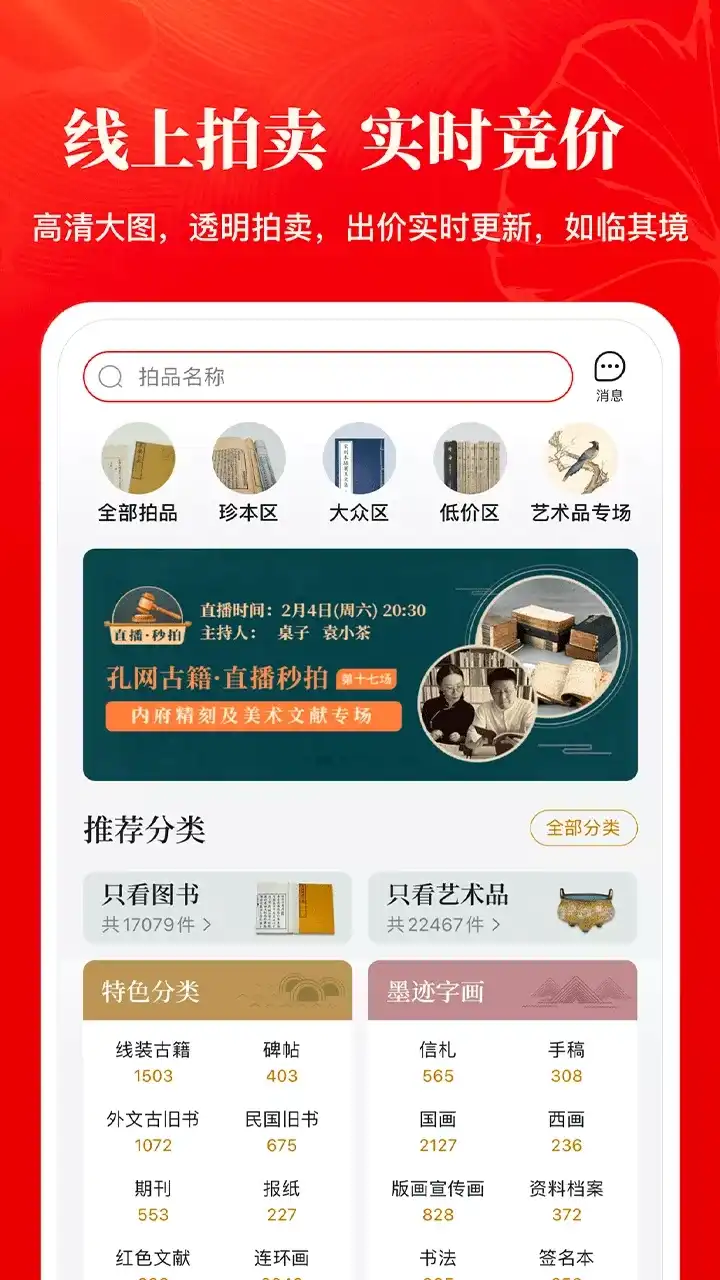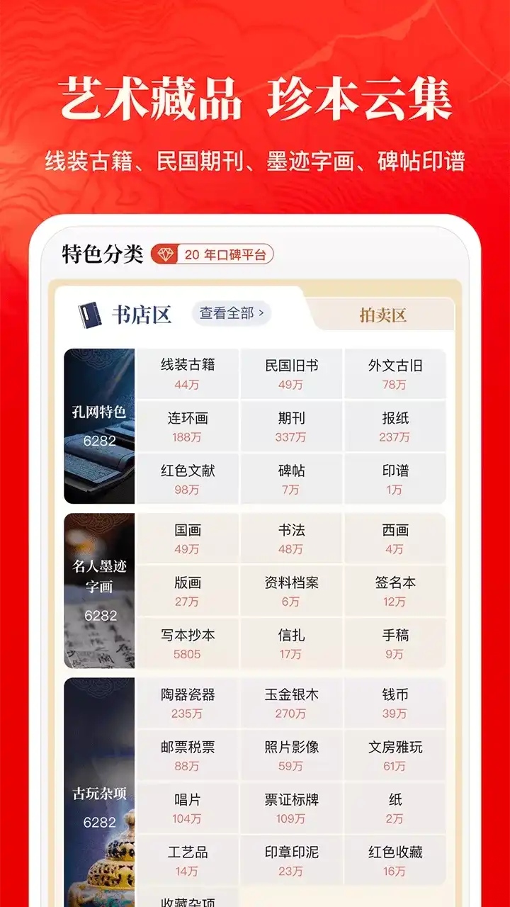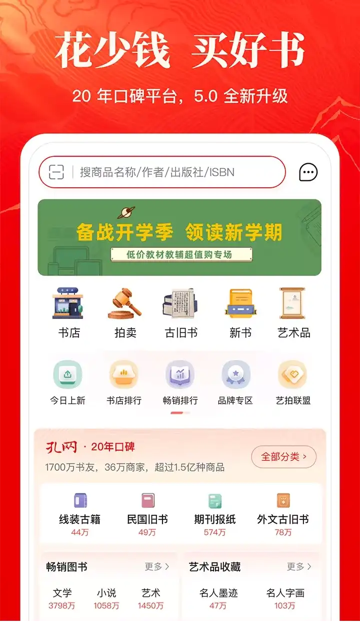 孔夫子旧书网——网罗天下图书,传承中华文明。 国内专业的古籍旧书、二手书籍、艺术收藏品交易拍卖平台网站,全球领先的中文网上图书城,购书响当当。众多书友首选的购书网站,买您买不到的书。 作为民间古旧书收藏的风向标,孔网为买卖双方提供极具参考价值的古旧书籍交易拍卖数据。您可以免费开书店在线卖书,将个人藏书或艺术品交易变现;也可以逛逛网上书店捡漏淘宝,享受淘书乐趣。 【网上书店】 汇集全国18000家网上书店、230000家在线书摊,展示9000万种图书;孔夫子网上书城提供海量优质的特价书、二手书、畅销书,是读书人的淘书圣地。 【经营品类】 1、图书大全:古旧书、二手书、畅销书、特价书、教材教辅、考试用书、线装书、古籍善本、民国旧书、国学古籍、报纸期刊、老照片、外文原版书、签名本等 2、艺术收藏品:名人墨迹、信札、连环画、字画、红色文献、老旧地图、碑帖印谱、版画宣传画、老照片、邮票、钱币、陶瓷、玉器、文房雅玩、古玩杂项等 比当当网、京东商城、亚马逊图书种类更全,比淘宝网二手书数量更多,购书者首选的图书交易网站,购书尽在孔夫子网!