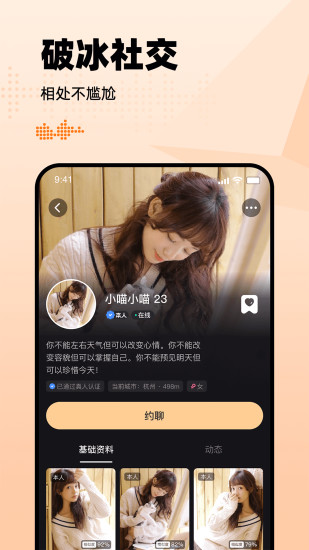 轻松匹配,就上约见~ 真实高效,玩法多样! 同城约见,是一款打造的本地化社交应用,致力于解决现代人在忙碌生活中寻求真实、高效社交的需求。应用结合地理位置服务与智能化匹配技术,为您创造更真实,更靠谱的交友机会。 【主要功能】 1.智能推荐:运用先进的人工智能算法,能根据用户的个人资料、兴趣爱好以及社交行为,为您推荐合适人选。 2.视频约会:一键连线,即可享受实时视频交流的乐趣。告别枯燥的文字聊天,用视频传递更自然的笑容,更灵动的情绪,让彼此的心更近一步。 3.听音觅友:通过声音的独特魅力,搭建一个真诚而温暖的交友空间,让你听见世界,也让世界听见你。 4.缘分速配:深度解读你的兴趣爱好、生活习惯、价值观等多维度信息,为你精准匹配潜在的理想伴侣。(让心动不再错过) 5.家族广场:提供一站式家族成员交流平台,增进彼此之间的了解与关爱,从此你不再是孤单一个人。 6.爱情故事:犹如一部精致的时光宝盒,记录着一个个平凡而又非凡的爱情传奇。TA一起秀秀小恩爱,互动交友,展现真挚情感! 【真实高效】 严格遵循隐私保护政策,真人认证放心交友。