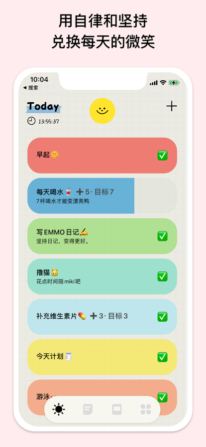 用自律收获笑脸,小小的梦想也需要日常努力的点滴。 微笑清单秉承EMMO Corp.的极简小清新的设计,没有花里胡哨的图标,只有清晰的日常清单。 这里也没有吵闹的社交,面对自我,认识自我。 在这里打卡,变得非常简单,提前规划好每天的事项,您只需要右滑或者轻轻的按下习惯,ding的一声,您的打卡就完成了。 摇一摇,切换不同的打卡样式。 当然你可以长按,添加打卡日志,这样当你回顾你的计划养成的时候,会更加直观。 当你每天完成百分之60以上的习惯时,你就可以收获笑脸,这样你就可以获得一张精美的卡片,你可以点击它,在它的背面写下 你的对生活的感悟,同时你又可以获得一张很可爱的Tracker,将你的微笑保存下来或分享给你的朋友。 等不及想看你们的笑脸了,让我们一起加油,用点滴的努力和自律换得微笑的美好生活。 关于微笑Todo高级版的订阅服务 该服务是订阅制的收费服务,你可以选择按年、买断的方式来使用该服务。 高级版(按年)是订阅制的收费服务,这意味着您将为未来的订阅使用而提前预支费用。当前您可以选择以按年的方式来使用该服务。在每个订阅周期即将结束时,您的订阅默认将自动续费,除非您自行取消自动续费,或者由我们取消该服务。 - 费用: 具体价格请查看微笑Todo内部页面 - 退款: 当期的订阅和一次性买断费用将无法退款。请务必确保功能服务满足您的需求。 - 取消订阅: 如需取消续订,请至少提前24小时操作取消。您可以通过如下方法取消:打开系统设置 - 点击Apple ID - 点击订阅 - 选择微笑Todo订阅,取消订阅即可。 使用条款: https://gist.github.com/AUDILIGITHUB/e0496ef6d8ec201fac55b6278b1fe85c 隐私协议: https://gist.github.com/AUDILIGITHUB/fbca36d687ea7c7d218359dfeda7c559