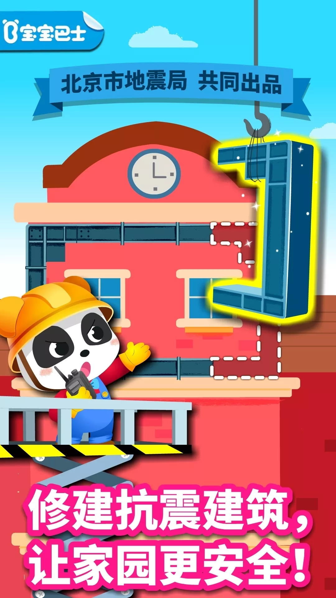 “地震安全系列”新作《宝宝建城市》问世啦! 由宝宝巴士与北京市地震局共同研发!为儿童科普建筑物抗震原理。 孩子们通过建造抗震建筑,认知建筑物抗震设施的名称与作用,学习地震安全知识! 孩子在《宝宝建城市》中,可修建桥梁和7种建筑,分别是:摩天大楼、木头亭子、小别墅、工厂、百货商场、医院和学校。 避开地震断层、河滩、山崖等自然灾害频发地带,选好稳定安全的区域,就可以盖房子啦! 第一步:加工抗震材料! 1.斗拱结构零件。 将圆木切去枝桠并抛光,然后切削出零件形状,再用砂纸打磨,最后涂上防水漆! 用零件组装斗拱,用来支撑房屋。斗拱可以通过位移和变形抵消部分地震能量! 2.钢构件。 把钢构件拼接成长方形或梯形,再用焊枪将缝隙焊接起来,形成坚固的钢结构! 钢结构可以让房屋更加稳固,在一定程度上抵御地震。 3.混凝土 混合碎石、水泥、沙子和水,用搅拌机搅拌均匀,就变成了混凝土! 在建造抗震建筑时,混凝土能在许多地方派上用场! 第二步:建造抗震建筑! 1.加固地基! 挖走液化的土壤,换上粗石子和土方压实,填满混凝土! 在加固后的土地上建造房屋桥梁,它们才不会下陷,也能抵抗地震带来的摇晃。 2.浇筑剪力墙! 用铁丝捆扎钢筋,搭建框架,然后浇筑混凝土,剪力墙就完成啦! 钢筋和混凝土建筑的剪力墙,可以在地震中防止房屋结构被破坏! 3.安装防震设施! 把橡胶隔震支座固定在地基中,在摩天大楼楼顶设置风阻尼器! 这些设施,能在地震中保护建筑物,提高建筑的安全程度! 抗震建筑建好啦!用彩色的瓦片和油漆来装饰它们吧!快看,城市变得更美了呢! 快来与城市建筑师奇奇一起,修建抗震建筑,学习地震安全科普知识吧! 宝宝巴士从健康、语言、社会、科学、艺术五大领域关注幼儿成长,根据幼儿不同年龄段左右脑发育、敏感期特点和学习重点来设计产品,打造“年龄+能力”的教育产品体系。让孩子学会独立思考,享受探索世界的乐趣。 【宝宝巴士】是全球3.5亿家庭用户的早教选择! 【宝宝巴士】儿童早教app,众多父母的选择,获得宝宝巴士、宝宝巴士儿歌、宝宝巴士奇妙屋、宝宝行为认知、宝宝巴士乐园、宝宝鸟类认知、宝宝天气认知、宝宝认知大全等使用者的一致推荐。 在【宝宝巴士】,我们自己也身为爸爸妈妈,所以非常重视儿童的健康和儿童的隐私。下载应用前,您可以从这里阅读我们的儿童隐私政策:http://cn.babybus.com/index/privacyPolicy.shtml _________ 欢迎联系: 微信:宝宝巴士 微博:@宝宝巴士 官网:http://www.babybus.com 邮箱:cn@babybus.com
