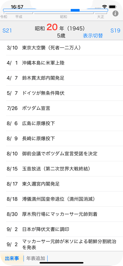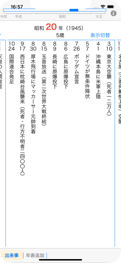 ・「現代史年表」は、大正から現在までの社会の出来事を調べたり、思い出すためのアプリです。 ・本アプリは、「おもいでキット」(高齢者や認知症の方のQOL向上を図るiPad用アプリ)の年表データを利用して制作したものです。 <特徴1>大正から現在までの現代史の変遷 ・年表を横方向にスクロールさせ、大正から現在までの現代史の変遷を追うことができます。 <特徴2>両親が二十歳のときの社会の出来事は? ・出生年を設定することにより、年表に年齢が表示されます。 ・例えば、両親が二十歳のときの社会の出来事も直ぐに分かります。 <特徴3>インターネットと連携 ・年表からインターネット上の関連情報(事典・動画・画像など)へ簡単にアクセスでき、各出来事の詳細を知ることができます。(インターネットへの接続が必要となります。) <特徴4>各種年表の追加 ・現代史のほかにも、オプション(App内購入)で各種年表を追加できます。