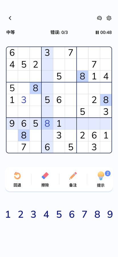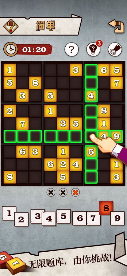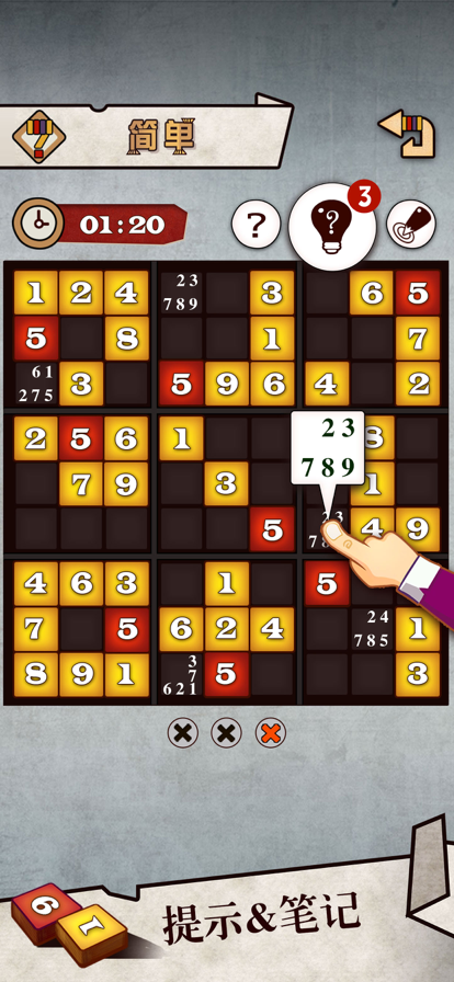 数独,多重难度,体验从新手到高手的进阶之路。 源自18世纪瑞士的益智项目。你需要根据9x9方格上的已知数字,推理出剩余空格中的数字,并且同时需要满足方格中的每一行,每一列,包括每个粗线宫(3x3)内的数字均含1-9且不重复。 数独在传统数独的基础上还新增了笔记功能,在不确定的空白方格中用笔记记录方格可能的答案数字,帮助推演过程更加顺畅。同时简单的ui界面,让你更加专注于谜题解答的同时,保护视力,舒缓压力! 简单的数字,无穷的思考,缜密的逻辑,解题的乐趣,都能在数独中体现出来,来试试吧,体验数字的魅力! 在此次更新中,我们修复了一些小bug并进行了一些优化。希望您能喜欢我们的产品!如果您有任何反馈或疑问,请与我们联系!