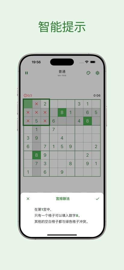 各类数独的题目/答案/逐步讲解,可拍照录入(部分题型)。 支持三宫、四宫、五宫、六宫、七宫、八宫、九宫、十宫、十二宫、十五宫、十六宫、不规则数独、杀手数独、肯肯数独、摩天楼数独、温度计数独、箭头数独、克隆数独、奇偶数独、回文数独、三明治数独、小杀手数独、不等号数独、堡垒数独、之间数独、德国耳语线数独、斜线数独、奇偶胶囊数独、黑白点数独、外提示数独、双色蛋糕数独、连续数独、田大数独、钟面数独、电子表数独、四格提示数数独、排除数独、星积数独、九邻数独、方向数独、X和数独、寻6数独、寻9数独、奇偶扫雷数独、转轮数独、奇偶线数独、反对角线数独、斜井数独、慢温度计数独、灰格连续数独、奇偶属性数独、指大数独、斜连续数独、奇偶大小数独、六邻数独、VX数独、56数独、不规则和差数独、连续对数独、加减数独、项链数独、缺一门数独、多一数数独、雪花数独、四阶六角数独、管道数独、三角数独、六角星数独、四阶圆环数独、半数独、蜂窝数独、3D数独、魔方数独、彭罗斯三角数独、八阶五星数独、立体风车数独、重影数独、武士数独、四宫连体数独、六宫连体数独、双叠数独、三叠数独、花数独、风车数独、合体-3数独、蝴蝶数独、十字数独、僧兵数独、W数独、五连体数独、十三连体数独、星型数独、六阶半数独、八宫蜂窝数独、额外区域数独、对角线数独、窗口数独、同位数独、百分比数独、星号数独、烛台数独、中心数独、金字塔数独、乘积数独、比例数独、加法数独、减法数独、四舍五入数独、和或差数独、归零数独、质数数独、定向连续数独、大中小数独、边框和数独、大小数数独、奇数数独、偶数数独、天平数独、不连续数独、无缘数独、无马数独、无象数独、无四数独、斜不连续数独、连通不规则数独、字母对应数独等。 还有技巧教程和丰富的在线题库哦~ --------------- 秒杀模式:直接给出题目的答案; 辅助模式:解题过程逐步讲解(同一步骤可切换多种解法) --------------- 标准数独规则:将1~9填入9x9的盘面中,使每行、每列、每个粗线宫(3x3)内均不重复。 不规则数独(锯齿数独):每行、每列、每个不规则的宫内的数字不能重复。 杀手数独:杀手笼(虚线所示)上的数字表示该区域宫格的数字之和,虚线内的数字不能重复。 肯肯数独(聪明格、算独):每行、每列的数字不能重复,每个粗线分组左上方的数字和运算符号(+-×÷)表示该组内数字通过该运算得出的答案。无运算符号则表示该组可用上述任一运算符。 摩天楼数独:外提示数表示从该角度可以看到的楼房数量(高楼会挡住低楼,即大数字会挡住小数字),无外提示数的地方无限制。 温度计数独:从圆形端到平头端,数字必须由小到大排列。 箭头数独:圆圈内数字等于该箭头所经过的所有格子中数字之和。 克隆数独:颜色标识的多个相同形状的克隆区域中,相同位置上的数字必须一致。 奇偶数独:带圆形的宫格必须是奇数,带方形的宫格必须是偶数。 回文数独:每条回文线上的数字序列必须对称,即正读和反读完全一致。 三明治数独:盘面外的数字表示该行或该列中夹在1和n(最大数)之间的所有数字(不含1和n)之和。 小杀手数独:带箭头的数字表示该方向对角线上所有数字之和,且对角线上的数字允许重复。 不等号数独(数比数独):增加了大于符号,数字之间必须满足相应的大小关系。 堡垒数独:灰格数字大于与其相邻的白格数字。 之间数独:灰线上的数字必须介于两端圆圈内的数字之间。 德国耳语线数独:线上相邻的两个数字之间必须至少相差5。 斜线数独:斜线上的数字不能重复。 奇偶胶囊数独:胶囊中的两个数字必须为一奇一偶。 黑白点数独:黑点两侧数字是2倍关系,白点两侧数字差1,没有黑白点的格之间不能有上述两种关系。 外提示数独:外提示数表示对应位置前三格内所含的数字,提示数排序没有限制。 双色蛋糕数独:双色蛋糕符号标记的2x2区域必须包含2个奇数和2个偶数,且相同奇偶性的数字呈对角分布,全标。 连续数独:挡板两侧宫格的数字相差为1,无挡板的两个宫格的数字相差一定不为1。 田大数独:箭头指向的是周围四格中唯一最大的数字。 钟面数独:黑点表示相邻四格需按逆时针方向数字逐渐增大;白点表示相邻四格需按顺时针方向数字逐渐增大,全标。 电子表数独:标注的横向连续4格需组成24小时制电子表时间。 四格提示数数独:盘面内提示数表示周围四格内出现的数字,顺序不限。 排除数独:圆圈中的小数字表示不能包含在相邻两格或四格内。 星积数独:盘面外的数字表示该行或该列中星号格的数字之积。 九邻数独:盘面外的数字表示在该行或该列中9的相邻格里的所有数字,顺序不限。 方向数独:盘面外箭头对应的三格内数字沿箭头方向依次增大,未标注箭头的位置则说明这三个数字没有特定的递增或递减关系。 X和数独:从外提示数方向看,第一格数字是X,对应前X格数字的总和等于该提示数字。 寻6数独:格内标记的箭头表示从此格开始,往箭头方向第X格是6,X是该格的数字值。 寻9数独:格内标记的箭头表示从此格开始,往箭头方向第X格是9,X是该格的数字值。 奇偶扫雷数独:圆圈格若是奇数/偶数,则其相邻8格中奇数/偶数的数量等于该数字(边角格按实际相邻格数计算),全标。 转轮数独:轮子
