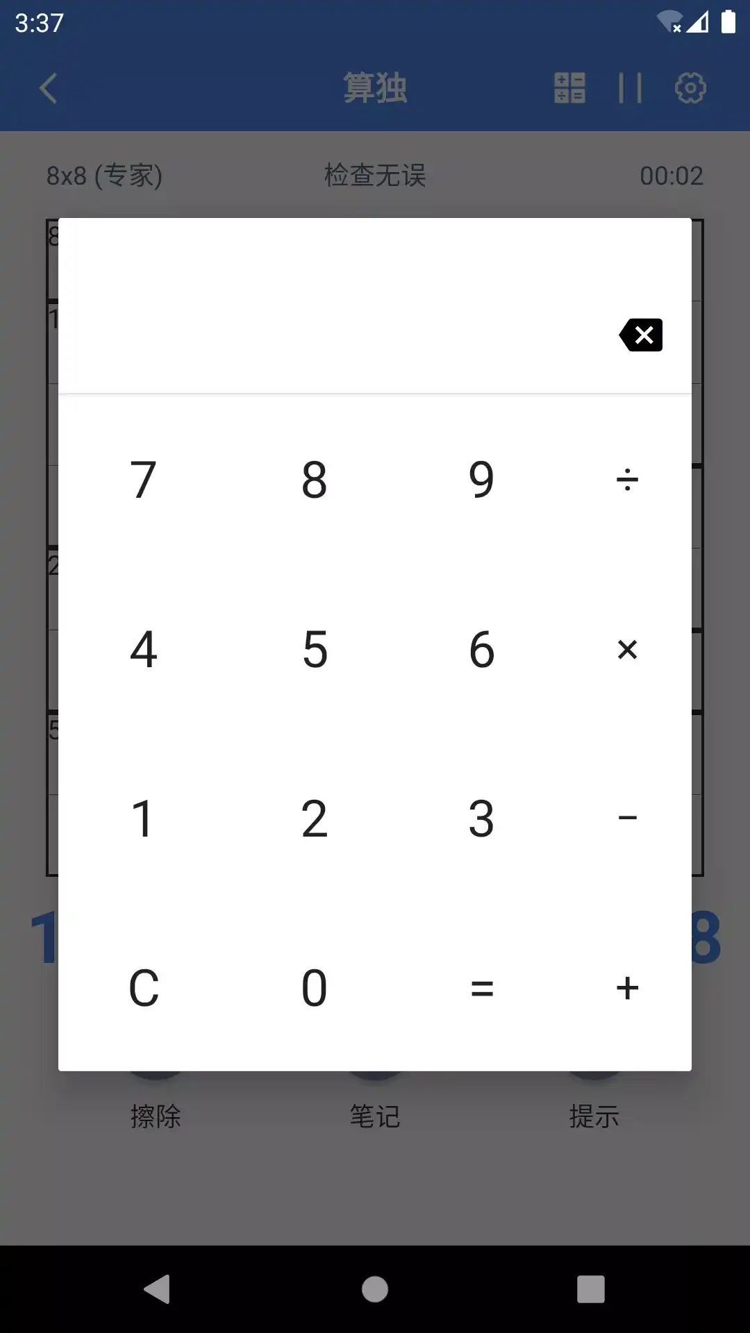 算独KenKen,也称为聪明方格、KenKen、Newdoku、Mathdoku、Kendoku、贤贤,是数独与数学的运算的巧妙结合。 在做算独谜题的过程中,既能像数独那样锻炼人的逻辑思维能力,又能同时训练人的数学的运算能力, 对数学思维能力的提高也有很大的帮助。题目设置由浅入深,不仅有趣好玩,同时也能寓教于乐。 算独规则: 1 每个算独都有唯一的解法,可以用逻辑推理得出。 2 填充网格,让每一行,每一列的数字均不重复。 3 粗线里的一组数字满足计算提示,比如9+,意思是粗线里所有数字相加等于9,9=1+2+3+3。 我们有不同难度级别的算独,入门级3*3宫格简单易上手,专家级9*9宫格复杂专业考验实力。 复杂运算可以使用内置计算器辅助计算。 设置选项支持错误高亮显示及音效开关设置。 统计功能,每个难度级别最佳时间,平均时间,连赢等数据统计。 笔记模式可以辅助填数,每局可以有三次机会获得提示~