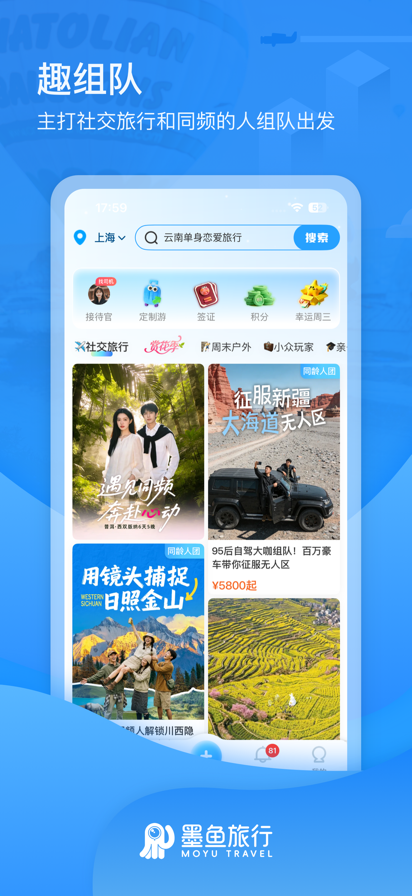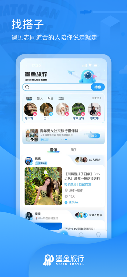 墨鱼旅行是一个有趣的社交旅行平台,专注解决“和谁去”的问题。 我们的使命是为用户匹配最精准的旅行搭子,做最安全的保障机制,筛选符合不同圈层人群的专属旅行。 在出行前用户可以在平台互动聊天交个朋友,也可以发起自己的搭伴行程,还可以选择和志同道合的队友组队出发。 我们围绕“同频”的概念不断深耕,通过同样目的地、出发地、同年龄层、同兴趣层、同职业、同口味等多项维度精准地帮助用户匹配同频的搭子。 安全方面平台不仅提供了实名认证,还有更多的爽约押金,社会身份认证、平台交易保障、平台保险保障等安全保障机制。 在筛选行程上面,我们先定人群圈层再定产品,根据每个圈层人群对关注的关键的指标筛选主题行程。 一次完美的旅行不仅要有创意的玩法,舒适的体验,更要有志同道合、灵魂共鸣的同行人。