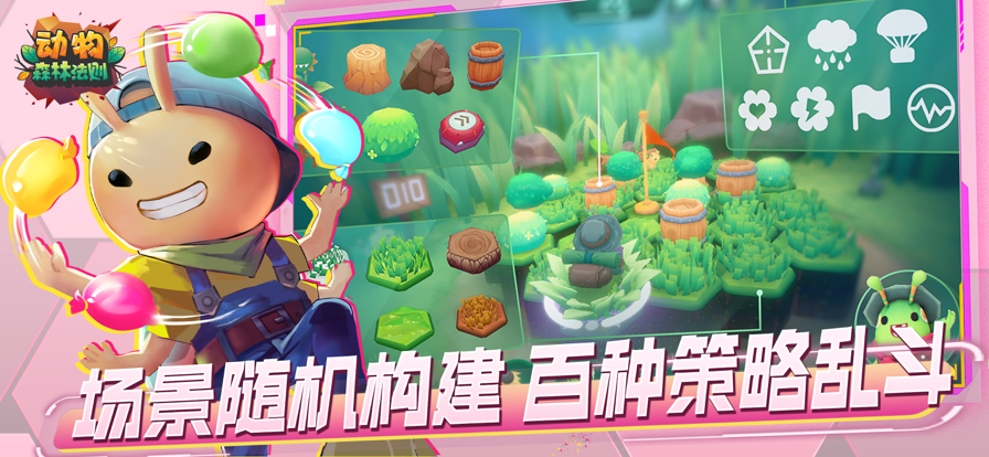《动物:森林法则》是一款战棋休闲竞技游戏。挑选不同性格又可爱呆萌的虫虫英雄角逐赛场!你需要综合英雄独特的技能、赛场随机构建的棋盘、影响战局的随机事件,用策略击败对手。还能用各式道具挖坑弹飞,整蛊队友~在快节奏的公平对抗中,成为最强、最萌的虫虫! 游戏特点 【森林百变萌虫,角逐竞技赛场】 可爱虫虫申请出战!别看他们呆萌的外表,但各个身怀绝“技”:平时胆小的“波波”一到赛场就能扛炮狙击暗处的对手;从小热爱武术的“洛奇奇”赤手空拳,其招式和威力让对手都不敢靠近;“斗帝”已到中年,仍旧有一股子不服气、爱耍棍打斗的劲儿。森林里集结这样一群虫虫,比赛一定精彩绝伦! 【回合制走格子,新战棋新趣味】 回温童年的经典棋趣玩法!回合制、不同地形要素,保留战棋的策略性之外,游戏还将加入缩圈机制,加快战棋节奏,上演更多高能片段。包含策略与竞技的新战棋,战斗一触即发,让你体验烧脑与戏剧的爽快乐趣。 【场景随机构建,百种策略乱斗】 随机构建,策略百变!游戏充满各种Roguelike元素。随机地块:草地、雪地、水域等,地块之上将随机生成不同障碍元素或隐藏元素,还有少数的道具宝箱等待挖掘!即使战局优势在敌方,降雨天气等随机事件也将打乱作战节奏,或许能祝你一臂之力。带上最强大脑和最强心脏,逆风翻盘! 【三分钟速上手,五分钟迎高潮】 不秀操作秀策略!手残也能玩出花,只需轻动小指头,就能影响整个战局,制霸全场!预判对手方位,布阵棋局,快节奏攻防,轻松KO对手。随时随地开局,5分钟迎游戏高潮,10分钟即可再来一局! 【伙伴挖坑整蛊,开黑快乐加倍】 森林喜剧人集结!“坑队友”才是娱乐赛的正确打开方式。我为你挖坑,你将我困住,我们就这样互相折磨到比赛最后一刻~轻松娱乐无所畏惧,但排位绝不拉胯!合力围堵、你侦测方位,我投送松果,让对手无处遁形!