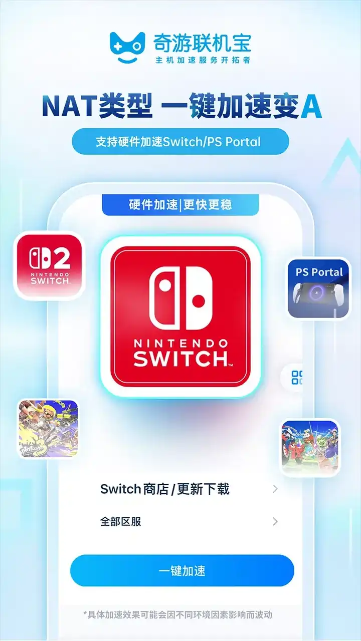 支持手机热点或Wi-Fi、联机宝硬件、路由插件、Steam Deck插件4种类型方式加速主机。 热游新游包括且不限于:怪物猎人等系列、使命召唤系列、FC/eFootball足球系列、NBA 2K篮球系列、暗黑破坏神系列、宝可梦系列、喷射战士系列、集合啦!动物森友会、舞力全开系列、战地系列、APEX英雄、绝地求生等,如您有其他加速需求也可以随时告知我们。 【支持手机加速】 支持手机热点或者Wi-Fi加速Switch1、Switch2、PS Portal,随时随地开启游戏下载联机新体验! 【支持Steam Deck插件加速】 快捷安装,无需繁琐硬件,畅游Steam Deck联机游戏世界! 【支持路由器插件加速】 手机连接家庭Wi-Fi,自动识别并安装路由器插件,一键开启全主机平台加速,告别主机游戏下载慢、联机不流畅的糟糕体验! 【奇游联机宝加速盒】 PS5 Pro/PS5/PS4/Xsx/Xss/Switch1/Switch2/Steam Deck主机连接上硬件加速盒的Wi-Fi,即插即用,无需电脑一直开机,告别繁琐操作,一键优化NAT类型,主机硬核玩家优选!支持游戏库识别主机类型自动显示,加速智能匹配区服,轻松开启主机硬核畅玩时代! 专业主机加速,丰富支持Switch,PlayStation,Xbox,Steam Deck,Oculus Quest 2等系列。 一键加速智能分配节点!解决商店无法访问、NAT类型限制、游戏下载慢、无法连接服务器、实时延迟高、游戏画面卡顿等网络问题。 支持上千款主机游戏商店的访问加速,新游热游的下载、联机、串流等加速,热门游戏的教程、官网、工具等加速。 奇游联机宝App,注册即送免费时长,快来试试吧! 联系我们: 使用过程中,如有任何问题或建议请直接联系我们,我们非常重视您的游戏体验! 官方 QQ 群:725871940 官方公众号:联机宝