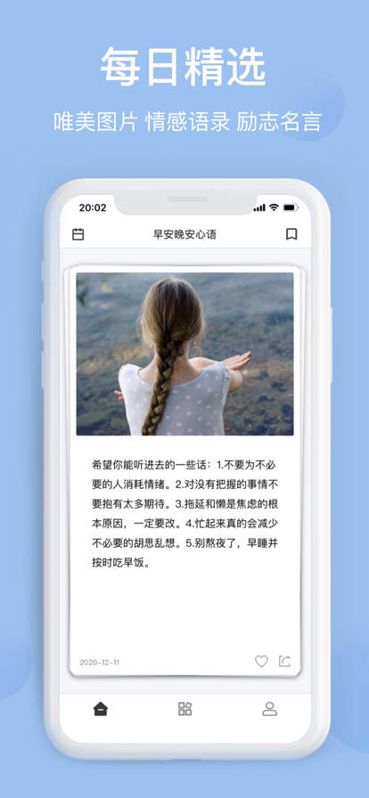 每天精选优质语录和短篇美文,这里有励志的、唯美的,心动的,伤感的、开心的句子。 一句语录,一句歌词,一段台词,一句摘抄,触动人心的往往是这些短小精悍的精彩总结。 愿你在这里,每天都能遇到一句让你赏心的话,一幅悦目的图! 我们是一个极简的每日阅读应用,没有复杂的功能,我们喜欢纯净和简单,相信优美文字和图片的力量,带给我们每日温暖! 赶快下载我吧,每天坚持花5分钟读一读,让心灵跟上你的步伐!