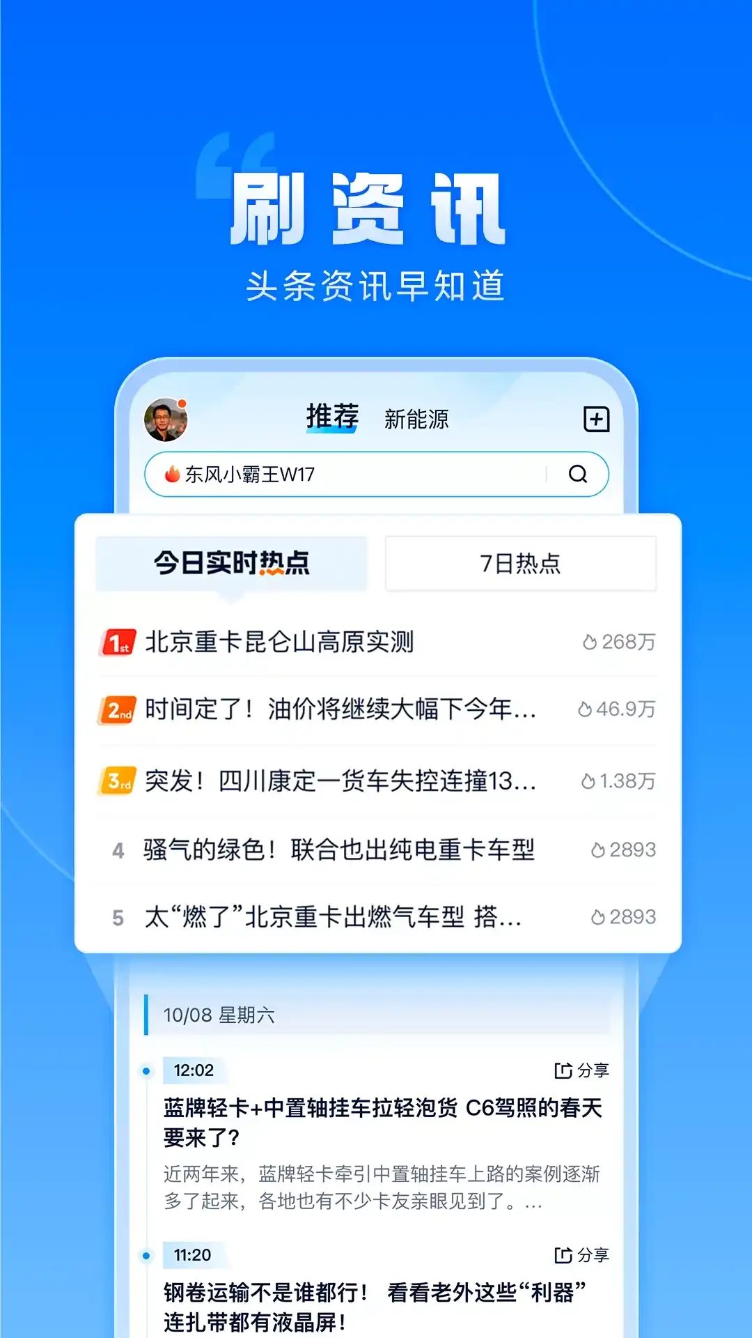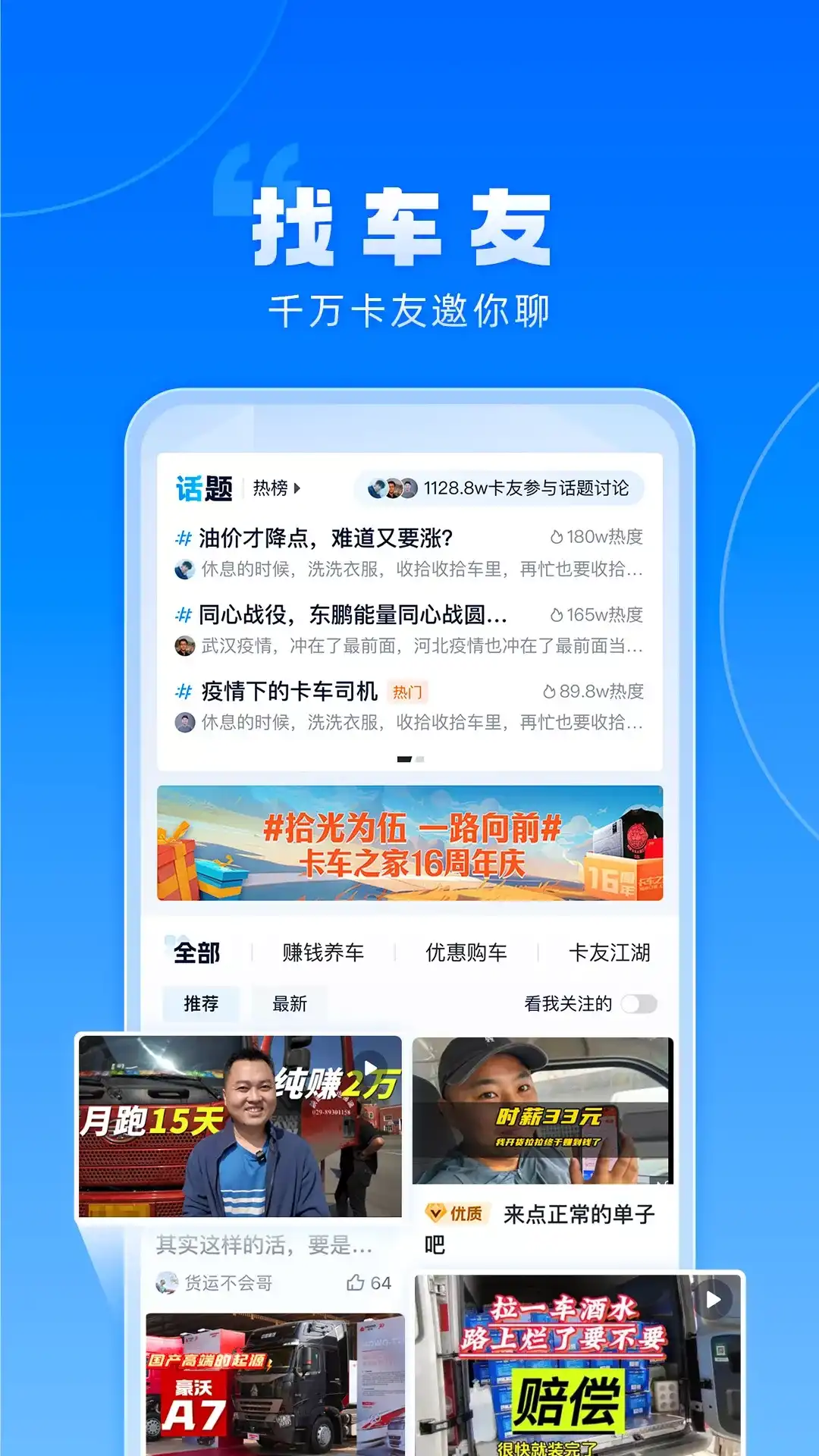 卡车之家是卡车门户网和商用车互动服务平台,集货车报价大全、卡车资讯、卡车论坛、购车用车工具、货车配件商城等功能于一身的移动应用。 肩负使命为卡车人提供可信赖的服务驱动产业前行,让从业者更幸福。 【货车报价大全】 1、卡车报价库:买卡车必查,收录17万货车参数配置,真实经销商价格,还可一键询价经销商; 卡车实拍图片197万张。 2、新车上市:带您即刻时间了解新上市车型图片参数配置报价; 3、新能源车:全面的新能源车型优质的续航榜为大家选择新能源车型提供高价值参考。 4、场景选车:根据所运输货物类型,不同使用场景路况推荐更加精准符合该使用场景的车辆配 置,买车更专业。 5、看图选车:360VR全景看车,全方位看图选车不用再跑实体店看车。 6、排行榜:一手掌握受欢迎度高的热门车型;热门轻卡排行榜,热门牵引车排行榜,热门载货车 自卸车排行榜,热门新能源车排行榜等 7、车型对比:对比不同车型,货比三家,选择更优车型。 8、配件查询:养车用车更方便,提供全面配件信息和经销商报价信息。 【卡车资讯】 商用车海量原创内容占全媒体70%,卡车新闻、行情导购、养车常识、政策法规,专业详细车辆评测,物流信息等30+种视频栏目,重卡,中卡,轻卡,新能源频道,图文阅读量2465万, 月原创文章463篇,月原创被转发6万次。 【卡车论坛】 393万实名注册用户,累计发帖4197万,火热的卡车人交流论坛,卡车人养车,用车,买车交流地,用户覆盖中国超过63%卡车司机 。 【互助问答】 买车,养车,用车,实时路况,行情政策等各种问题快速得到专业解答 【司机招聘】 免费发布招聘信息服务车队8万+,主动联系车队免费服务司机50万+;只发布真实信息,不断筛选诚信优质的车队和司机,智能匹配符合需求的司机。 【配件商城,正品保证】 保证正品货车配件,滤清器、机油,安全防护、底盘部件等正品配件。 【二手车】 买卖二手货车无忧,让用户买车更放心,卖车更高效,车源信息均严格审核,累计车源52万+,月访客80万+。 【优惠购车】 低价买好车,让卡友卖车更“省”心