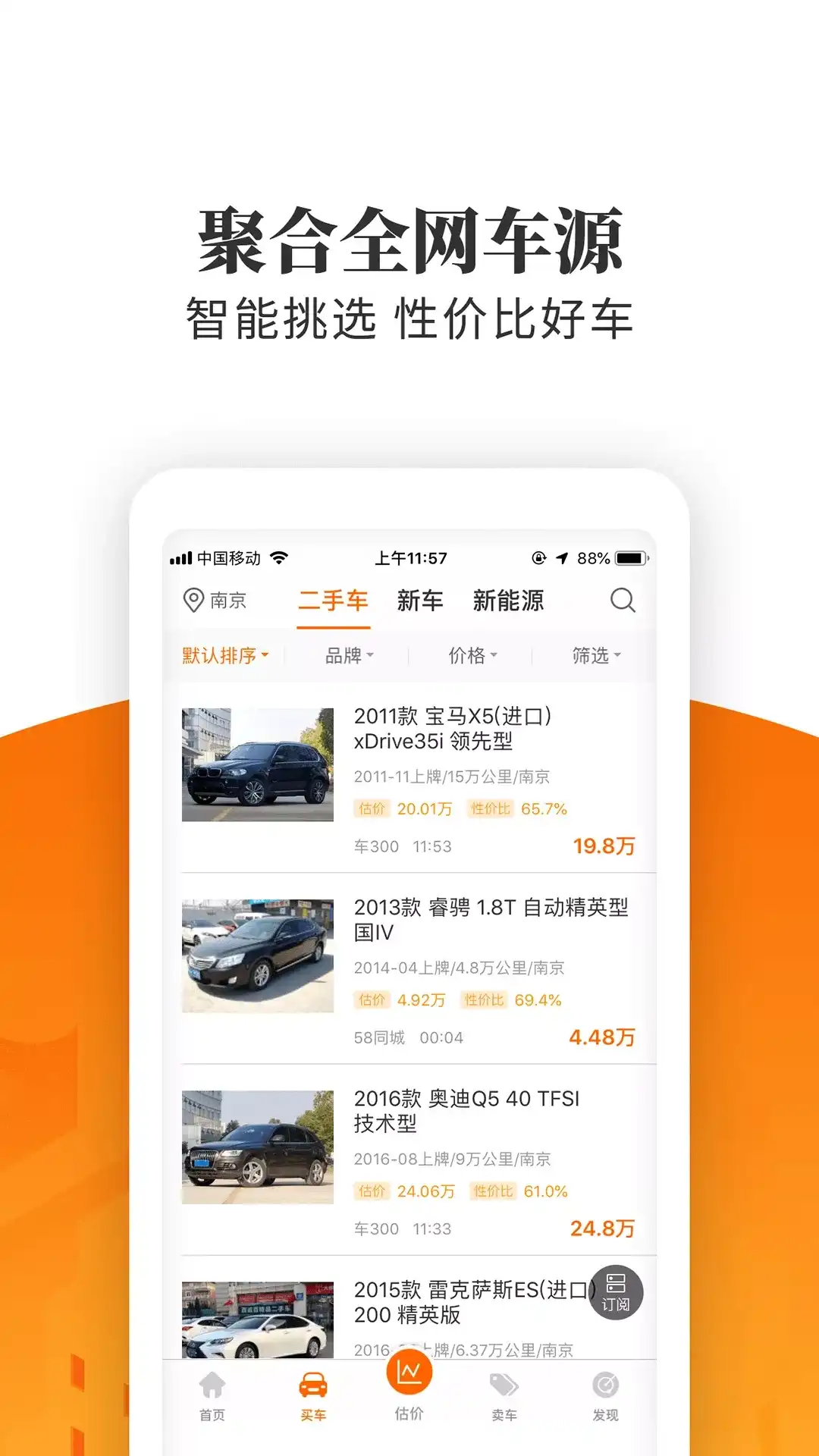 买卖二手车,先上车300! 查车价、查车型、查车况! 【二手车估价】 1.免费估值:买车查价,卖车估值,看真实成交记录。为全网95%的二手车交易提供估值服务 2.精准定价:基于车身颜色、使用性质、真实车况等因素的定价 3.车况定价:基于车辆历史出险记录、维修记录的定价 【二手车必查工具】 1.车型识别:准确识别车辆型号、年款、参数配置信息,核验高低配,买车更放心 2.综合车况:一键查维保、出险、新能源电池、事故车信息,杜绝事故车,买车不吃亏 3.维修记录:查车辆历史维修记录、保养记录和公里数 4.出险记录:查车辆历史出险记录、事故理赔金额 5.新能源电池:查电池损耗程度、电池组安全性能 【买车服务】 1.二手车海量车源:聚合全网多平台车源,真实可靠 2.二手车价格参考:车300估价参考,性价比判断,同款近期成交记录等 3.新车底价特卖:特价优惠,底价新车抢先购 【卖车服务】 1.高价卖车:免费帮卖,一键推送多平台比价,谁出价高卖给谁 【用车服务】 1.车辆残值追踪:爱车残值变化实时掌握 【关于我们】 南京三百云信息科技有限公司是国内优秀的以人工智能为依托、以汽车交易定价和汽车金融风控的标准化为核心产品的独立第三方的汽车交易与金融SaaS服务提供商。 品牌致力于为广大车商、二手车交易平台提供基础数据库服务,自研车300 伽马风控系统服务于银行保险机构、汽车主机厂和车贷金融公司。 【联系我们】 官方微信号:che300 官方微博:@车300 官网:http://www.che300.com 客服电话:400-858-7585转1 注: 1、您在使用应用时,我们需要访问您的相机,以便获取车辆图片,识别车型信息。 2、您在使用应用时,我们需要访问您的GPS,精准定位帮您快速找到附近优质车源,以及相关的优惠活动。
