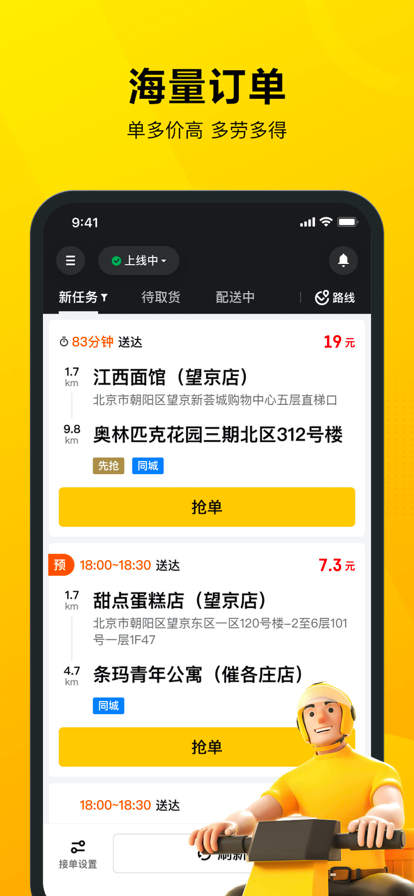 美团骑手是美团外卖专为配送员量身定制的配送App,服务于广大的加盟商和美团自营配送团队,旨在帮助配送员更好、更快地为美团外卖的商家及顾客提供配送服务。骑手可以在该平台方便地接收配送订单、管理订单信息、查看统计数据等。 【新骑手权益】 美团骑手超多跑单福利来袭!免交保证金,免服装、免餐箱,免实地培训,新手车电补贴,纯新骑手优先派单,新手期内提供超时消除卡、超级消除卡、入职初期收入补贴福利,保证骑手在有限时间内享受超优跑单体验。 【平台优势】 0门槛快速跑单:免交保证金,学历、经验不限,免服装、免餐箱,免实地培训; 新人特权:优先派单特权,超时消除卡、超级消除卡强势来袭; 新骑手补贴权益:对加盟纯新骑手在入职初期进行单均收入补贴; 海量订单,多劳多得,收入丰厚,上不封顶; 新手车电补贴:给新注册骑手提供换电、组车、装备等优惠券; 新骑手模拟接单:模拟真实跑单APP操作流程,帮助骑手在模拟环境下了解并熟悉配送全流程,可用于骑手自学或老骑手培训场景; 新骑手接单引导、履约引导:对纯新骑手,通过接单设置引导气泡,引导设置同时接单量、常驻送货区域;在上线、接单、到店、取餐、送餐环节,通过对骑手进行正向操作和异常场景引导,辅助新手更快上手操作,提升跑单体验,同时降低违规率; 派单打卡:对纯新骑手,通过派单打卡的方式,在骑手送单场景,顺便打卡附近重点商圈小区,帮助骑手实操熟悉商圈,更高效地上手跑单。 定向辅导:针对某一违规的频率达到阈值的新骑手,在跑单结束且无单时推送其如何避免违规的技巧。 新手教育面板:对纯新骑手,通过知识讲解,帮助小白骑手快速成长,掌握必备技能和平台规则,提升新手期体验; 师徒制活动:支持为新骑手匹配师傅,徒弟由师傅亲自带领和指导完成学习、跟跑任务,更快地熟悉配送知识和流程; 【温馨提示】 美团骑手产品在使用过程中会持续使用GPS定位服务以便给用户派发附近订单,切换至后台使用时,仍会继续。相比其他操作会消耗更多的电量,影响电池的续航时间。 Continued use of GPS running in the background can dramatically decrease battery life 仅支持iOS 11及以上的系统安装和使用美团骑手