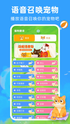 宠物猫咪翻译器是专为爱宠人士开发的狗狗猫咪宠物交流翻译器,是宠物达人的好用软件!集狗叫猫叫模拟、狗语猫语翻译于一体的动物语言交流翻译器!人狗人猫交流翻译器会让主人和汪星人喵星人更加亲密! 【人宠互译】 狗语猫语翻译功能,人宠之间的沟通轻松顺畅! 长按录人声:输入你想对猫咪狗狗说的话,立马转化成宠物的语音,狗狗猫咪能听懂你想说的话,感受到你对它满满的爱意哦! 长按录猫语【狗语】:当狗狗猫咪对你叫的时候,长按录音,你就能读懂爱宠的情绪,快带它愉快的玩耍吧! 【宠物百科】 宠物年龄转换:宠物的年龄转换成人的是多少岁呢?输入宠物的出生日期即可一键计算哦; 宠物肢体语言:宠物是开心还是生气呢?跟着图片对照宠物的肢体语言动作就能判断出宠物的情绪哟; 揭秘猫咪性格:想知道你的猫咪是什么性格吗?我们根据猫咪的手掌形状为你一键解答。 【养宠打卡】 给宠物定期打疫苗、驱虫、体检、洗澡,带宠物出去玩,重要的事情太多怕记不住?这里有宠物记事本和事项提醒帮助你记录,需要做什么一目了然,让我们能更细致的照顾好宠物。