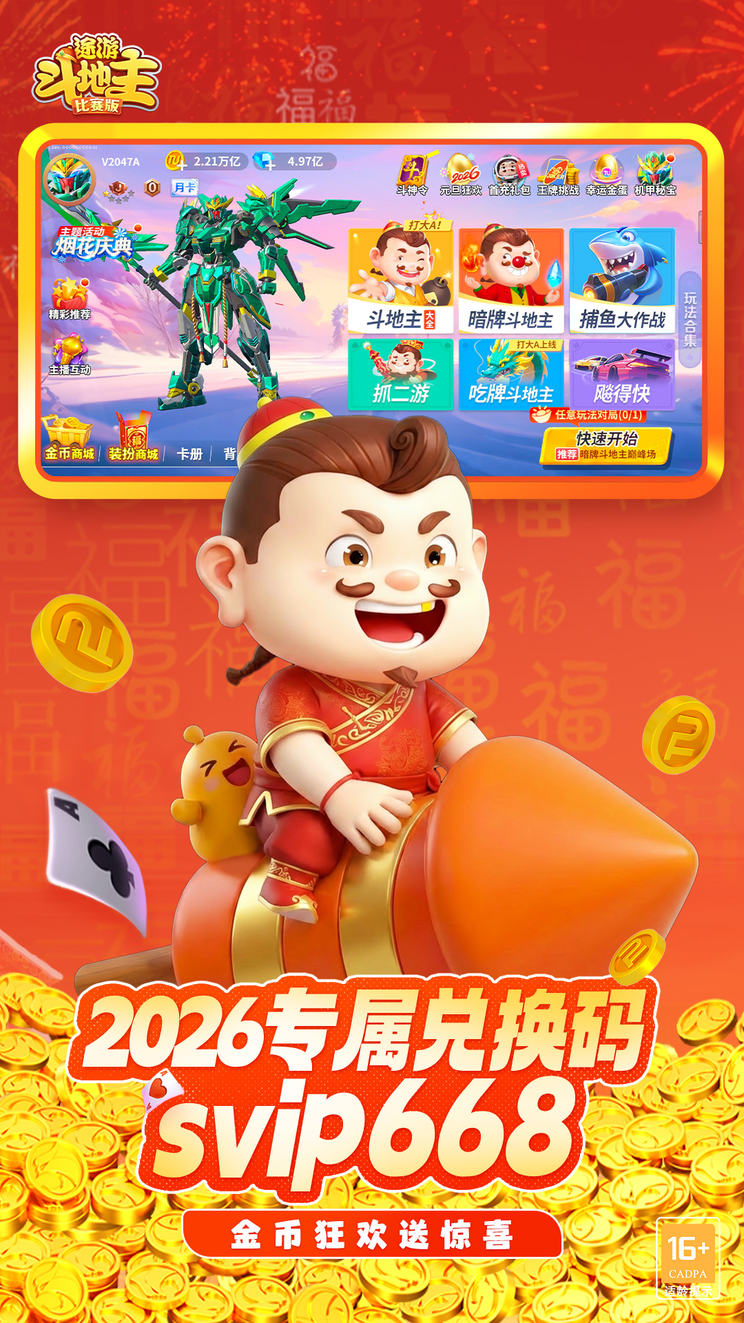 超过1亿次安装的斗地主游戏!千万用户好评如潮,倾情推荐。 快来尝鲜新玩法—八宝万花牌、换牌大爆炸,“斗”出地主新境界。 真实玩家同台竞技,定期活动更有惊喜大奖等你来赢。 游戏特色: 【八宝万花牌】四人桌,凑和牌,王牌癞子胡不停,宝牌加成翻倍赢,爽快刺激不能停! 【换牌大爆炸】地主VS农民,对决升级,限时换牌,趣味升级,疯狂连炸超过瘾! 【火爆赛事】全新竞技模式,火爆新高度。全天开赛,免费报名,赢千元实物大奖! 【天天豪礼】每天福利游戏豆,打牌实力赢豪礼。斗地主,挣家电,勤劳致富就靠你! 【超多玩法】经典:癞子、欢乐玩法;创新:八宝万花牌、换牌大爆炸、决战510k玩法,想怎么玩就怎么玩。 【精美画面】精致场景+经典人物,享受视觉盛宴,一起决战到天亮! 【角色合成】合成全新角色,解锁更多技能,坐享收益倍轻松。