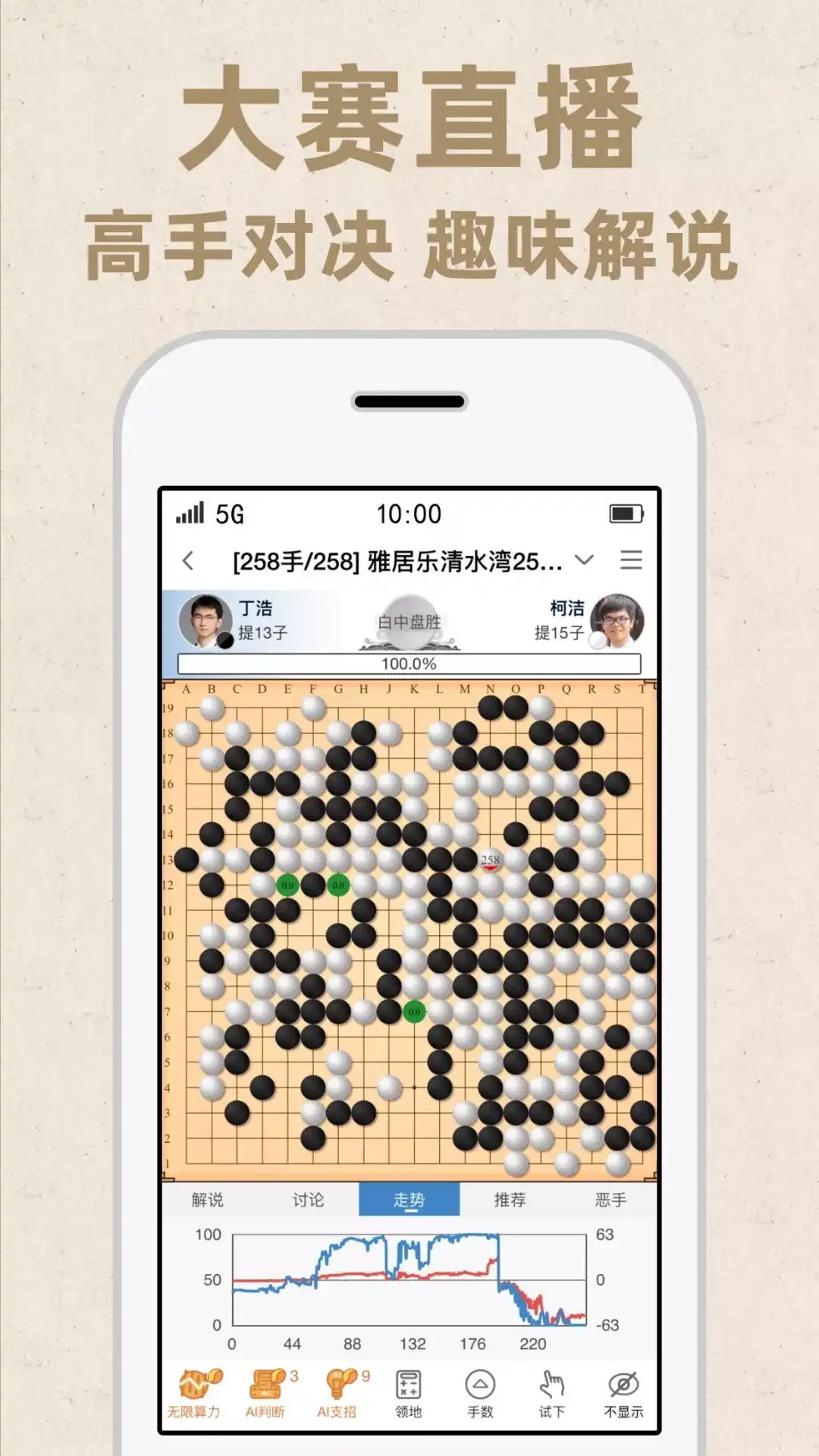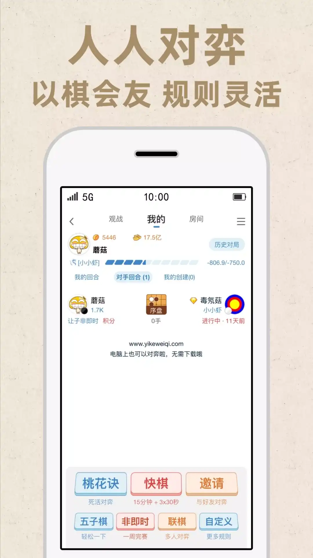 弈客围棋,记录你的围棋人生。 人人对弈 -水平全面覆盖,邀请与匹配,一键开战 -时间选择多样化,可自由选择即时对弈与非即时对弈 -支持分先与让子,还有特色“死活对弈”、“天弈”与“藏棋” 人机对战 -多难度设计,全水平覆盖 -特色“一命到底”玩法,探索更多有趣的盘面与规则 弈客鹰眼 -高算力围棋AI KataGo复盘报告 -App内棋谱一键分析,永久查看 -多维度数据:胜率图、选点与变化图、评分、吻合度、复杂度与稳定性 无限算力 -围棋AI KataGo实时分析 -多种云算力可选,App内棋谱一键导入 -自由配置贴子数、规则与棋盘路数 大赛直播 -国内外棋战免费看 -大赛人工讲解,与解说互动 -AI辅助分析,看胜率走势与问题手 弈客棋闻 -专业记者前方赛事报道,分享现场情报 -汇聚海内外围棋写手,多角度、多视点资讯与技术探讨 更多功能 -荣誉认证:认证围棋证书,记录围棋成长 -弈客排名:省市区棋力排行榜 -拍照数子:盘面识别,精准数子 -棋谱库:记谱打谱,棋谱分享,另有海量职业棋谱 -俱乐部比赛:自主创建比赛,一键编排,快速开赛。 -新手入门:免费入门视频与入门教程,从入门到业5