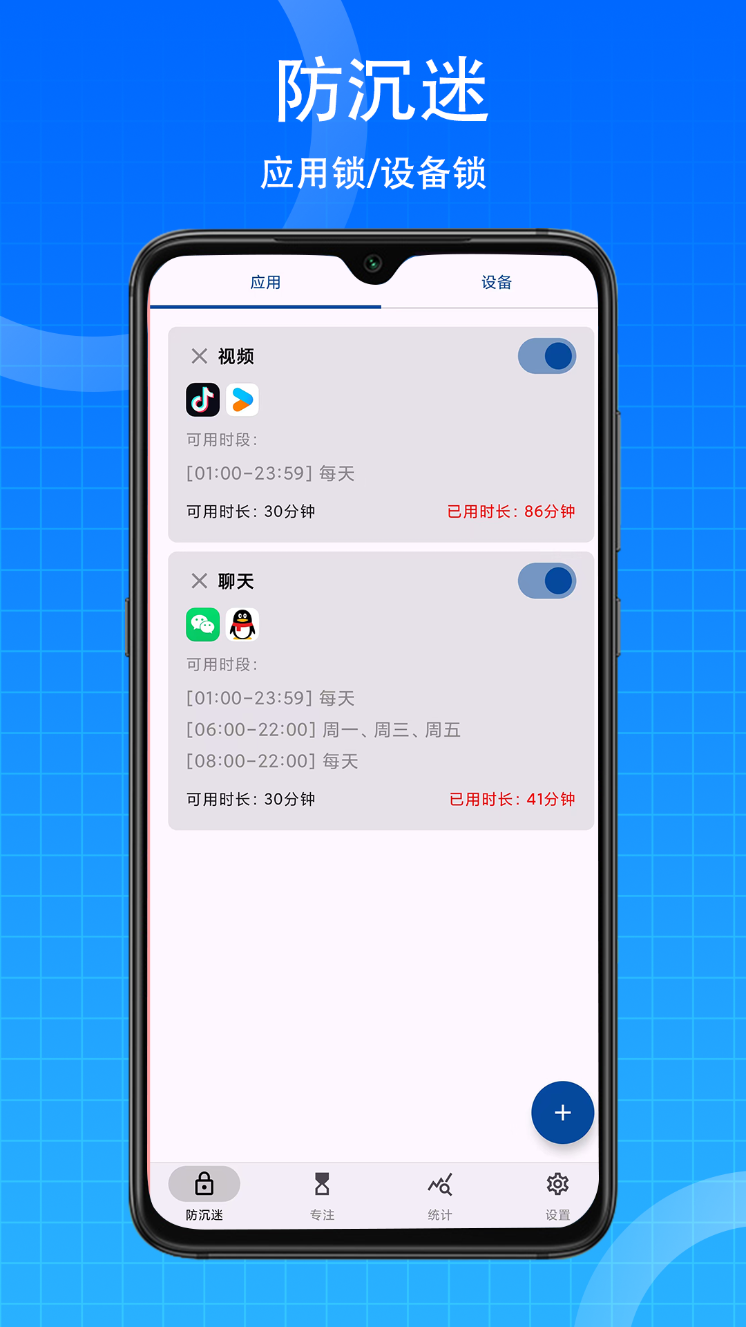 无意识地沉浸于各种娱乐应用中,不仅时间会不知不觉地消逝,还可能会对学习、工作和生活产生负面的影响,因此合理管理应用使用时间至关重要。为了帮助你远离这些问题,我们倾力推出了时间守护帮助您更好地掌控时间,实现高效的学习、工作和生活。<br><br>主要功能:<br><br>【防沉迷监控】实时监控应用使用时长,设定应用当日可用时长或每次使用时长限制,智能提醒与自动关闭应用,助您合理安排时间,避免应用沉迷。<br>应用使用正计时:实时监控三方应用使用时长,根据您预设的提醒文案,在适当的时间通过自定义文案唤起您的注意力,让您不再沉浸在应用中;应用使用倒计时:为三方应用设置当日可使用时长,让您更加自觉地安排时间。在预设的倒计时时间点,自动提醒您的预设文案,让您掌握时间主动权;设置应用的每次使用时长:在打开被监控的应用时,为应用设置本次使用时长,到时后自动关闭应用,让您避免无意识地浪费时间;<br><br>【实时提醒】悬浮窗功能实时显示应用使用时长,让你随时了解手机使用情况,提高自觉性和自律性。<br><br>【数据统计与分析】生成应用使用记录图表,帮助你深入了解自己的应用使用习惯,从而调整使用行为,实现更高效的时间管理。<br><br>【桌面小部件】一目了然地展示今日各应用使用时长和次数,让你更好地了解自己的手机使用情况,提升时间管理能力。<br><br>立即下载时间守护,让你的手机成为助力学习、工作和生活的得力伙伴,摆脱手机沉迷的困境。现在就行动吧,让时间守护助你成为更好的自己!