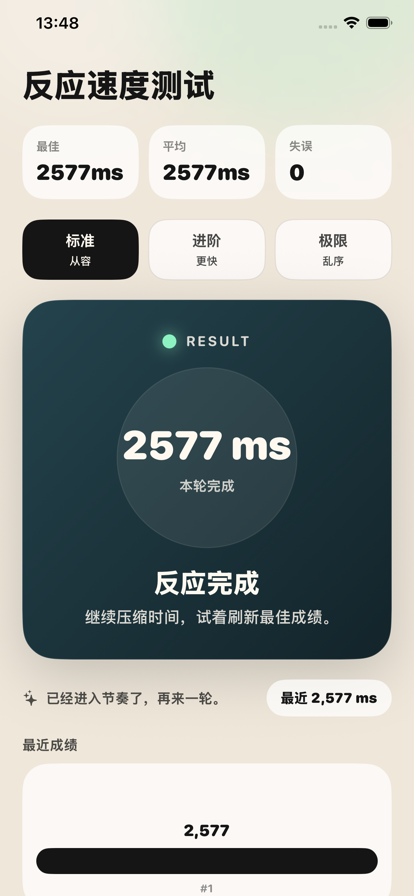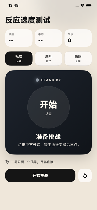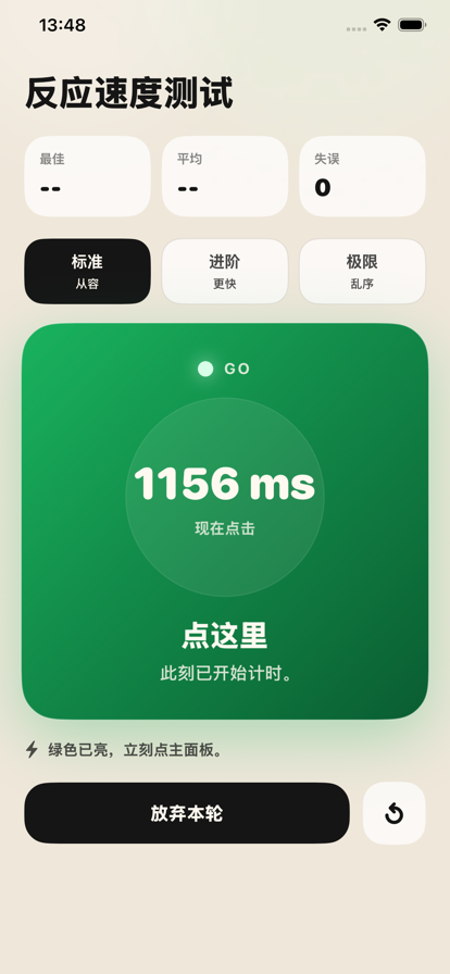 反应速度实验室支持单次冲刺和专注训练模式,支持多难度随机信号测试,支持结果记录和统计回顾,适合手速测试专注训练和电竞热身