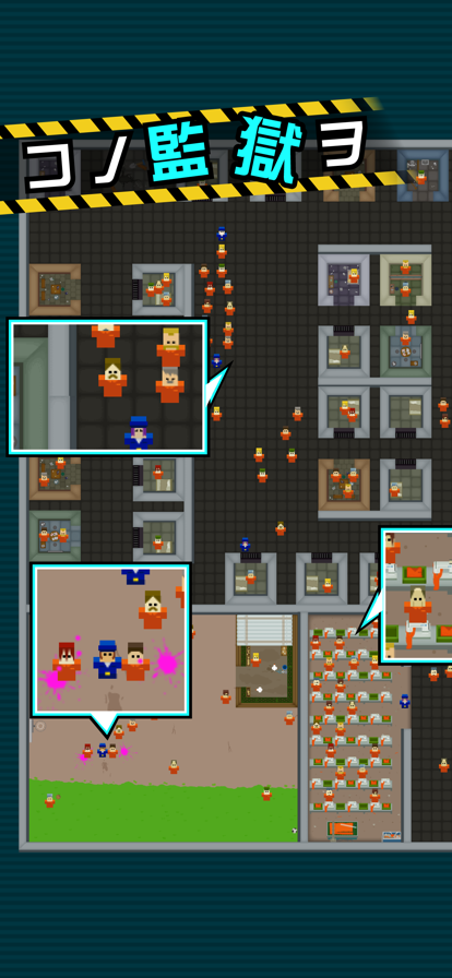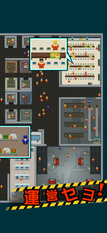 今日カラ アナタガ コノ監獄ノ 経営者デス ~刑務所経営シミュレーションゲーム~ 囚人や看守たちを監視し、巨大な刑務所を作り上げろ ■□■□■□ゲームの流れ■□■□■□ <運営準備> ・刑務所の設備拡張 ・看守の雇用 ・運営プランを立てる <運営開始> ・囚人や看守の監視 ・各部屋のランクアップ ・囚人や看守からの要望、ミッションをこなす ・運営費をためる ・暴動の鎮圧 ◇暴動 囚人たちのストレスがたまると、暴動を起こします ”どんな手を使ってでも”囚人たちを大人しくさせよう ◇要望 要望はお金がかかるものばかりです。 囚人にアメを与えつつ、手のひらで転がそう 囚人の要望にこたえる・・・囚人のストレス大幅減 看守の要望にこたえる・・・刑務所の経験値が貰える ◇ミッション ミッションをこなすと・・・ ・運営費が貰える ・部屋を建設できる場所が増える ・部屋の種類が増える