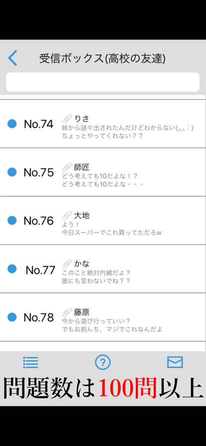突然届いた1通のメール。 その内容は、添付ファイルに謎の記号や文章。 あなたはこの謎を全て解けますか? < 遊び方 > 受信フォルダごとに用意された10問の問題をすべて解きましょう。 メールマークのボタンを押して、並べ替え問題にチャレンジしましょう。 見事並べ替えに正解すると、新着メール(新しい問題)が届きます。 全問正解目指して頑張りましょう! 1.問題は合計100問以上 ゲームを進めるごとに問題が難しくなっていきます。 2.問題に見事正解すると「キーワード」と「ポイント」が受け取れます。 ポイントはヒントを解放させるときに使い、キーワードは新着メールを受け取るために必要です。 3.問題がわからないときはヒントを積極的に活用しましょう。 4.ヒントを見てもわからないときはシェアして、解ける人を探してみましょう。 5.それでもわからないときには困り顔をしたボタンで答えを表示させましょう。 6.前の問題が解きたいときはリストボタンで受信フォルダを選択出来ます。 ※一度も閲覧したことのない受信フォルダは選択せ出来ません。 ※機種によっては回答が認識されない場合があります。 申し訳ありませんが「漢字」「ひらがな」「カタカナ」等お試しください。 使用音源 魔王魂 様 アイコン icons8(https://icons8.com/)