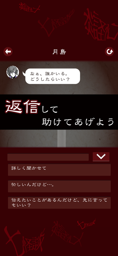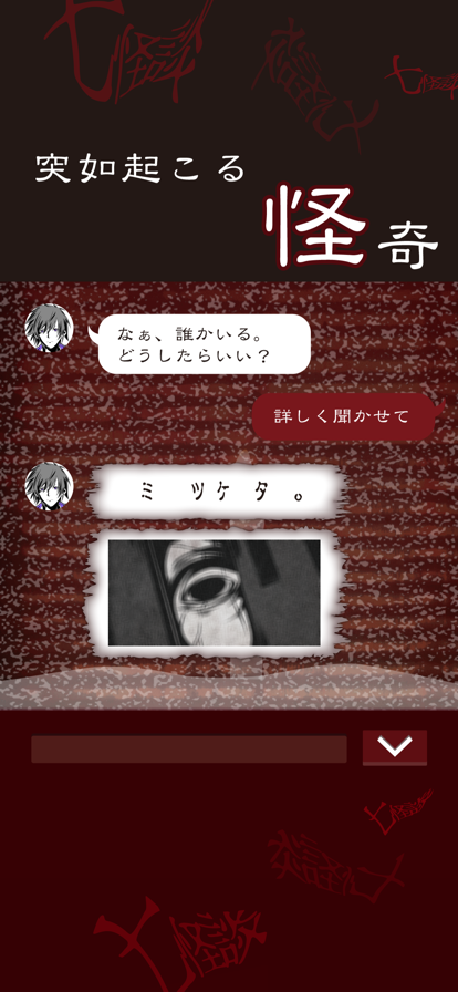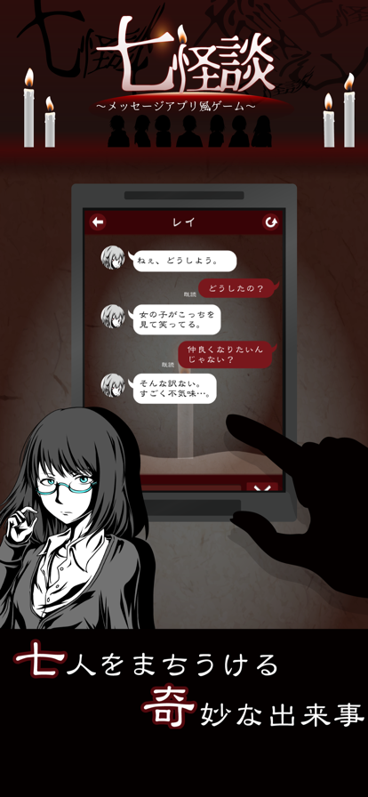 ■アップデート中止のお知らせと謝罪■ 七怪談の新シナリオ追加のアップデートを予告していましたが、アップデートでは、新システムの導入が困難な為、「十三怪談」として新規リリースすることになりました。 追加予定のシナリオは、「十三怪談」の方に収録されます。 【「十三怪談」について】 新アプリ「十三怪談」では、以下の新しいシステムを導入しています。 1.返信時間短縮機能 2.プレイヤーが好きなシナリオを選んで開始できるシステム 2のシステムにより、七怪談をすでにプレイされた方も、すぐに新しいシナリオをプレイできる作りになっています。 七怪談のアップデートを期待されていた方には申し訳ありませんでした。 よろしければ、十三怪談の方をプレイしていただければ幸いです。 リリースは8月上旬を予定しています。 <追加シナリオ> ・だるまさんがころんだ ・きさらぎ駅 ・八尺様 ・くねくね ・コトリバコ×メリーさん ・ヤマノケ ---------------------------------------- 「あれ?このメール何だろう…。」 ある日スマホに届いた、一通のメール。 ―――――――――――― “これは【呪い】のメールです” 3日以内にこのメールを【7人】に送らなければ… 身近にいる【7人の知り合い】に 不幸が起こるでしょう ―――――――――――― 「7人に不幸が起こる?」 いたずらメール、そう思ってこのメールを削除した。 その後すぐに、…友達からメッセージが着た。 「これ…何なの、…私、どうしたら!!!」 一度は聞いたことがある都市伝説、心霊ホラー、おとぎ話。 7人に起こる怪奇現象、恐怖、奇妙な出来事。 訪れる結末は果たして…? 頼れる相手は、あなたしかいない。 返信して、救出へと導こう。 ―あなたは、救えるか。