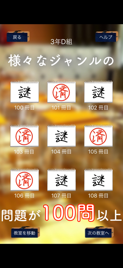 オレはこの学校に通う高校1年生。 放課後のある出来事がきっかけで、 この学校の全ての謎を解かなければなくなってしまった・・・。 謎を解きながらストーリーを完結させよう! < 遊び方 > 教室にある問題を全て正解して次の教室に進みましょう。 次の教室に向かう時に問題が出題されます。その問題に正解すると次の教室に入ることができます。 学校の謎をすべて解くことができればクリアです。 1.問題は合計100問以上 教室を進むごとに問題が難しくなっていきます。 全ての謎を解いて、物語を完結させましょう。 2.問題に見事正解すると「キーワード」と「ポイント」が受け取れます。 ポイントはヒントを解放させるときに使い、キーワードは次の教室に向かう時に必要です。 3.問題がわからないときはヒントを積極的に活用しましょう。 4.ヒントを見てもわからないときはシェアして、解ける人を探してみましょう。 5.それでもわからないときには「諦める」ボタンで答えを表示させましょう。 6.前の問題が解きたいときは「教室を選択」で前の教室に戻れます。 ※まだ鍵を開けていない教室は選択できません。 ※機種によっては回答が認識されない場合があります。 申し訳ありませんが「漢字」「ひらがな」「カタカナ」等お試しください。 使用音源 魔王魂 様
