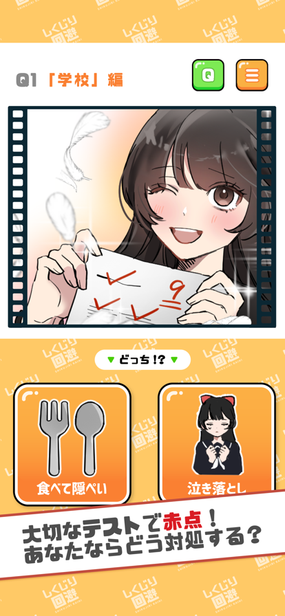 「テストの日に寝坊した!」 「校舎の窓ガラスを割ってしまった!」 「偉い人に飲み物をかけてしまった!」 日常に潜む数々のしくじり、あなたならどう対処する? 一歩間違えれば取り返しのつかない展開に!?絶体絶命のピンチを2択で選んで回避しよう! どんな結末になるかはあなたの選択次第! ●あそびかた まずは出題内容を確認 選択肢を選ぶ 正解数に応じてエンドが変わる! <使用素材について> ■BGM ・DOVA-SYNDROME https://dova-s.jp/ ■フォント ・にくまるフォント http://www.fontna.com/blog/1651/ ・チェックポイントリベンジ http://marusexijaxs.web.fc2.com/quizfont.html#quizfont5 ・コーポレート・ロゴB https://logotype.jp/corporate-logo-font-dl.htmll ・コーポレート・ロゴ(ラウンド) https://logotype.jp/font-corpmaru.html ・はなぞめフォント https://www.asterism-m.com/font/hanazomefont/ ・ぼくたちのゴシック https://fontopo.com/?page_id=55