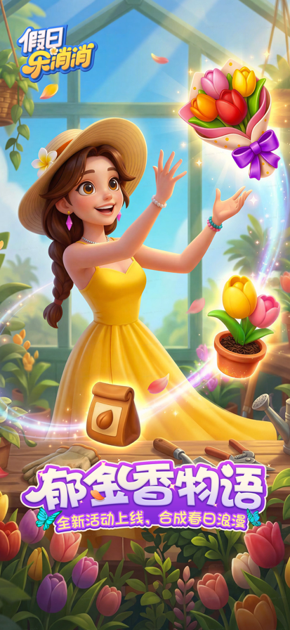 《开心消消乐》同厂力作《假日乐消消》——海岛建造三消手游全新登场!欢迎来到为你独家打造的掌上假日,享受畅爽解压的消除乐趣,打造百变海岛度假乐园。无需打包行李,指尖一划,阳光、沙滩、海风即刻拥有。消一下,就放假! ◆ 劲爽连击,引爆连环大消除 ◆ 假日岛必玩榜——爽到停不下来的解压三消!轻松合成满屏强力道具,火箭、炸弹、陀螺和彩球,一键触发超炫酷特效&动画!保持连胜即可获得开局道具奖励,策略组合威力翻倍,一步引爆打开棋盘!巧用心得:火箭、炸弹、陀螺相互组合,即可精准消除任意位置的障碍,又可提大幅升消除效率;终极王炸组合:彩球x彩球,瞬间清扫全盘障碍!轻松上手,脆爽十足,惊喜不断,为家人们奉上丝滑的消除体验! ◆ 趣味关卡,丰富障碍欢乐无穷 ◆ 超百变关卡、超趣味障碍,处处藏着意想不到的惊喜挑战! - 拍立得相机:海岛旅行必备单品,巧妙消除相机周围的方块就能获得相片,记录假日美好瞬间~ - 炫彩小冰棍:炎炎夏日的消暑利器,打破冰箱获得冰棍,没什么比泡在泳池里再上一根冰棍更满足的假期活动了! - 可爱小企鹅:你没看错,海岛也有小企鹅!消除企鹅脚下的障碍棋子,让它们回到水中尽情畅游~ ◆ 建造梦中民宿,解锁迷人海岛风景 ◆ 闯关获得海岛限定鸡蛋花,解锁为你量身打造的度假体验。在面朝大海的落地窗卧室中醒来,在私人游艇的甲板上尽情享受日光浴,在浪漫的水下餐厅享用美食,日落时分在露台看一场电影......每个房间每个场景,都是独特的风景! ◆ 海岛嘉年华,欢乐挑战奖励满满 ◆ 海岛主题活动接连不断,既可挑战好友,又可为公会团体而战,海岛假日拒绝无聊! - 疾速挑战:踩下油门,每一次消除都是加速引擎的轰鸣,与对手来一场刺激的赛车竞速!全速冲过3个赛段,即可成为假日岛车神,丰厚的奖励在终点向你招手; - 沙滩寻宝:加入公会遇见好友!一同协力闯关收集贝壳,收获属于团队的荣誉; - 彩灯快闪:夏日夜晚,彩球竞赛是一场精彩派对的保留节目!加入派对即可获得1小时无限彩球,与对手一较高低! ◆ 民宿“猫老板”,呆萌可爱随时陪伴 ◆ 《假日乐消消》头牌心灵理疗师是一只名叫毛毛的猫咪,无论闯关还是建造,它都陪伴左右——欢呼鼓励、傲娇卖萌,又或是调皮捣蛋。消除闯关,即可与它亲密互动。(放心,不会掉毛! 惬意假日无需等待,随时随地,假日就要乐消消! 如您在假日岛的旅行中遇到任何问题,欢迎随时通过 holiday_service@happyelements.com与我们联系