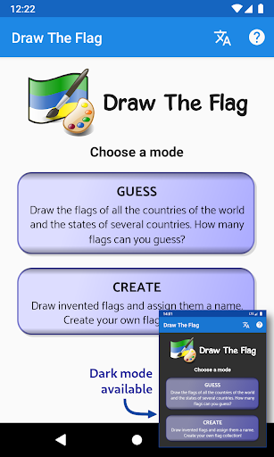 此应用既是<b>旗帜问答游戏</b>,又是<b>旗帜制作者</b>或编辑者。<br><br>作为一款游戏,它比经典的世界旗帜问答游戏更进了一步,因为在这里你不必选择旗帜来回答,而是实际绘制它!<br><br>对于世界上 193 个国家/地区中的每一个国家,您都必须选择与实际国旗及其自 1980 年以来最后一面官方国旗最相似的条纹、形状、符号和颜色。如果您需要帮助,您将能够要求提示,使游戏更容易。如果您在某处看到一面旗帜但不知道它属于哪个国家/地区,您可以在此应用程序中画出它来找出答案。<br><br>此外,从12.0版本开始,游戏不仅包括国家国旗,还包括美国、巴西、德国等州的国旗。总共有 <b>425 个标志可供猜测</b>!<br><br>作为一名编辑或制作者,您可以使用您最喜欢的条纹、形状、符号、文本和颜色来设计您自己的自定义旗帜,然后将它们下载到您的设备中,与您的朋友分享或随时随地使用。<br><br>测试您对世界各国旗帜的了解,建立您自己的旗帜收藏,并在 <b>Draw The Flag</b> 游戏中玩得开心!