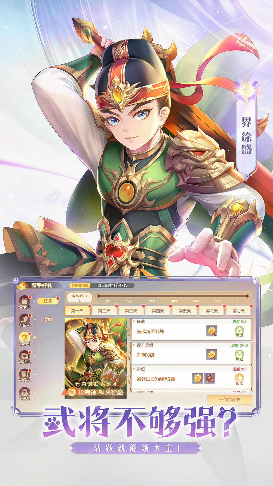 --登录即领限时豪华礼包ttsg0000(张飞、貂蝉、马超等)<br>--新玩家领100抽,天天十连爽爆抽卡<br>——————————————————————一款颠覆传统、融合策略与冒险的三国题材卡牌手游,正等待着您的加入!每一位三国英雄,每一场经典战役,都将以全新的卡牌形式,为您呈现一场前所未有的视听盛宴与策略挑战。<br><br>【游戏特色亮点】<br>重塑三国,英雄集结:<br> 数百位三国名将,从智勇双全的诸葛亮、勇猛无双的吕布,到忠肝义胆的关羽、奸诈狡猾的曹操,悉数登场,以精美的卡牌形象,重现那段波澜壮阔的历史。<br><br>策略至上,智谋对决:<br> 深度策略卡牌玩法,考验玩家的智慧与布局。自由组合卡牌,利用英雄间的技能克制与配合,制定战术,以智取胜,享受策略带来的无限可能。<br><br>沉浸式剧情,历史再现:<br> 原创与经典交织的剧情设计,让您仿佛置身于三国乱世,与英雄并肩作战,亲历那些耳熟能详的战役,感受历史的厚重与英雄的豪情。<br><br>养成系统,深度互动:<br> 丰富的武将养成体系,从升级、升星到装备强化、技能解锁,全方位提升武将实力。同时,通过日常互动,加深与武将之间的情感纽带,解锁专属故事与技能。<br><br>多元竞技,挑战无限:<br> 实时在线PVP竞技场,与全球玩家同台竞技,展现您的策略与实力。更有团队副本、公会战等多种玩法,与好友并肩作战,共享胜利的喜悦。<br><br>福利满满,轻松畅玩:<br> 登录即送豪华礼包,海量资源助力快速成长。更有丰富的日常任务、活动奖励与限时活动,让您在游戏中享受不间断的惊喜与福利。