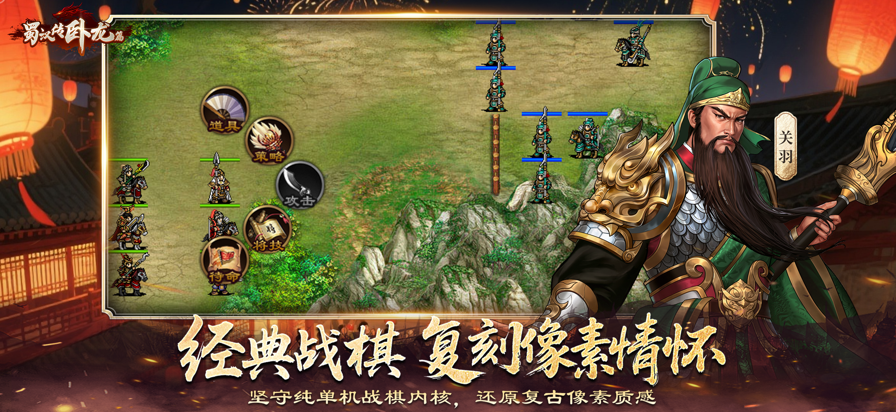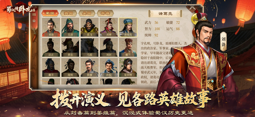 《蜀汉传卧龙篇》是一款三国历史题材的战棋策略游戏,游戏内使用的美术音乐均为原创,美术风格为了营造历史文化氛围所以整体比较偏古风。背景配乐采用二胡、古筝、琵琶等乐器合奏而成,古典雅致宛如诗词歌赋,曲调唯美,注重旋律,有其独特的中国式美感。 《蜀汉传卧龙篇》所演绎的故事剧情,是三国历史与三国演义的结合体,创作人员研究了大量历史资料,在历史和小说的蓝本上更加入了大量纯原创的故事解读,对整个南征和北伐进行了地理上、逻辑上的梳理和演绎,并进行了合理的虚构和描写,使剧情丰富多彩,人物性格清晰鲜明,玩家可以通过本游戏,了解更多的三国英雄人物,以及他们所创造的绚烂的传说。 《蜀汉传卧龙篇》的战场关卡设计非常注重平衡性,每一个武将都有他的长处和短板,了解武将特性利用好兵种克制和地形优势往往能起到事半功倍的效果。我们在保证平衡的前提下也更加注重游戏的趣味性,你可以充分开动自己的大脑,运筹帷幄,指点江山,战场上敌我的一举一动,都在你的控制之下,进攻还是防守,包围还是后退,都由你说了算。 除了正常的关卡挑战和剧情欣赏之外,我们还推出了历史文化类版块《黄锺瓦缶》,此版块内除了有玩家熟悉的宝物图鉴之外,还加入了人物图鉴、游戏音乐欣赏、游戏词典解析等诸多文化类内容。玩家在过关斩将的空闲,可以通过这个版块,了解与游戏有关的人物列传、道具说明、名词解析,从而获得各类相关的历史知识。游戏为皮,历史为骨,传播历史文化,一直是我们制作游戏的初衷。 《蜀汉传卧龙篇》是一款凝聚匠心,充满诚意的作品,希望您能喜欢并为我们多提出更多宝贵的建议,让我们一起把这款游戏打磨的更好,让我们一起把共同热爱的历史文化传承下去。 欢迎加入 玩家交流QQ群: 939818939