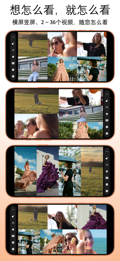 •多个不同或相同的本地视频或图片同屏播放; •可以增加到1格、2格、3格、4格、9格、16格(横竖屏); •支持单个视频操作(滑动屏幕控制播放帧和音量,视频快放、慢放、循环、暂停); •支持录制保存; •支持屏幕锁定来防止点击、精简的操作模式;