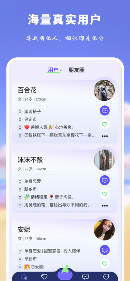 一款为了实现真实、用心交友而设计的,陌生人交友软件。在这里,你可以通过多种维度进行筛选,寻找自己中意的人。每一个注册用户,都需要尽量完善自己的个人信息,并确保真实,从而让大家放心交友,分享开心快乐,拒绝孤独... 同时,《走心漂流瓶》也是一款女生优先的交友软件,女生享有主动权,避免被骚扰,从而提升整体交友氛围,方便大家真真实实的交朋友,开启一段属于你们的美好回忆。 欢迎大家下载体验,并提供宝贵意见,帮助提升软件使用体验,感谢!