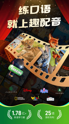 练口语就上趣配音!和1亿+小趣友一起学英语! 打通输出+输入学习闭环,让语言学习变得如此轻松好玩! AI智能学习,实时反馈+实战训练,助你告别哑巴英语! ------在英语趣配音可以做什么?------ 玩着就可以学英语! 【练口语】为经典内容配音学英语,百万素材选你选,影视剧库、热门动漫、经典动画、英文歌曲、同步教材…… 【练听力】你喜欢都可以随身听!视频一键转听力,听你想听,经典名著、必考词汇、英文演讲、历年真题…… 【背单词】百万原声视频例句,让你身临其境背单词,AI词汇私教1v1,加强词汇场景记忆, 掌握实际运用。 【同步练】教材全覆盖,预习复习两不误,萌宠AI学伴添动力,背单词、读课文、刷真题、单元测,完整科学学习闭环。 【AI语伴】AI口语陪练,中英文聊天,零基础学习,双语讲解,场景自由聊,外教一对一辅导,有趣又有聊! ------英语趣配音有什么?------ 1. 趣味形式学语言,告别传统枯燥学习法。 【看视频学】百万精彩视频,看剧学英语,与主人公原声对话,沉浸式学习! 【听歌学】经典英文歌曲边唱边学,流行歌曲、怀旧金曲、影视原声…… 【互动学】定期大赛,超多奖品等你拿,和大神切磋pk,还能邀友一起学! 【闯关学】游戏化练习,强化学习动机。知识点答疑,掌握重点难点。 【实战学】 费曼学习法,以用促学,实时任务监测,即时激励。 2. 多种趣味素材,覆盖多个领域。 【热门正版IP引入】迪士尼、小猪佩奇、巴塔木儿歌等官方正版授权,与主人公对话,身临其境学英语! 【多语种】全新日语、汉语的语种上线,更多语言学习选择。 【生词本】配音视频中的生词一键添加,覆盖语言学习生涯高频单词,加深单词场景使用记忆。 【多种词书】提供四六级、专四、专八、考研、托业、托福、雅思、GMAT、SAT、GRE等专业词书。 3. AI专业辅导,随时随地,在线学习。 【AI私教1v1】双语讲解,中英互译,例句引导,润色表达,打磨地道口语。 【专业打分】采用国家中高考口语打分系统,专业口语打分。 【实时反馈】音素级口语评测系统,AI智能算法多维点评,实时反馈发音语法问题并纠正。 【单词测试】可根据词书范围、数量、测试题型和时间速度进行个性化定制测试。 【能力测评】采用 CEFR(欧洲共同语言参考标准)框架体验研发英语能力测评,通过 5 分钟测试 10+道题,测出真实英语水平。