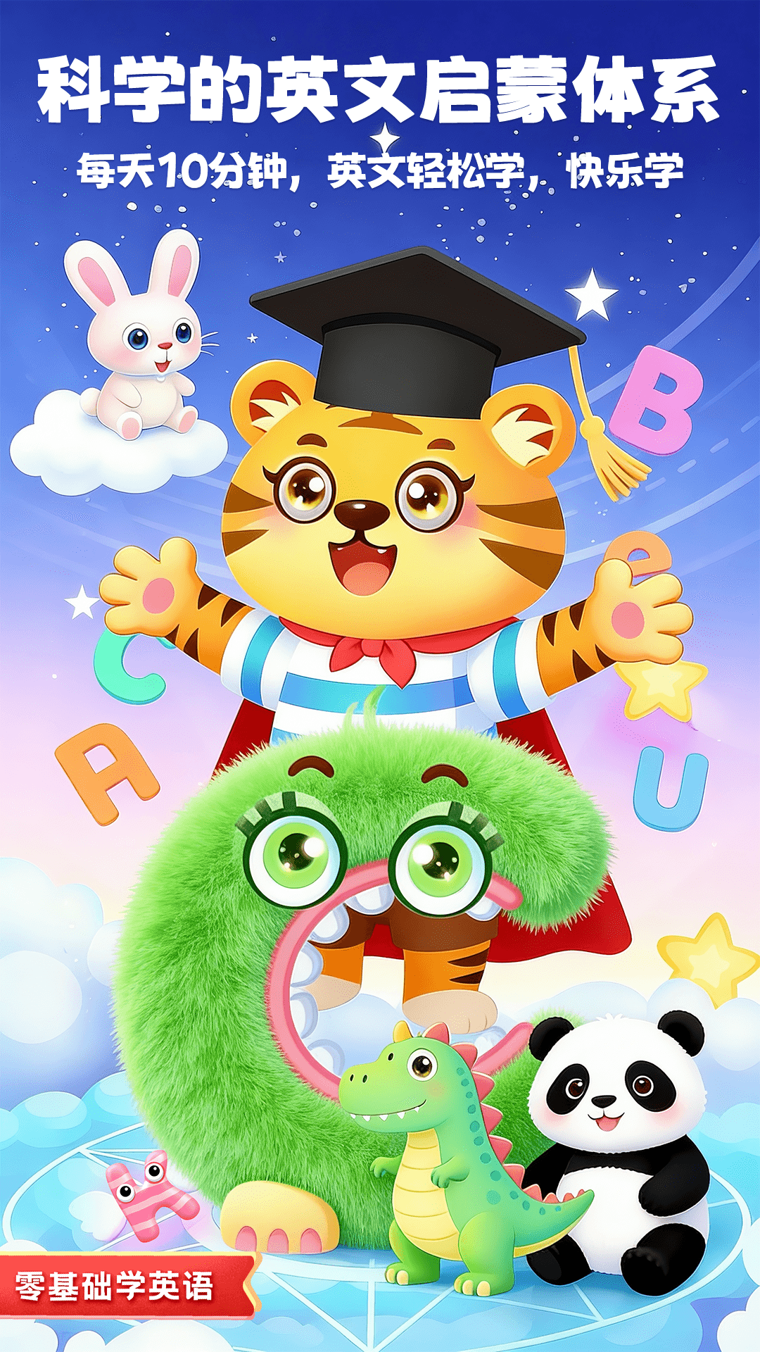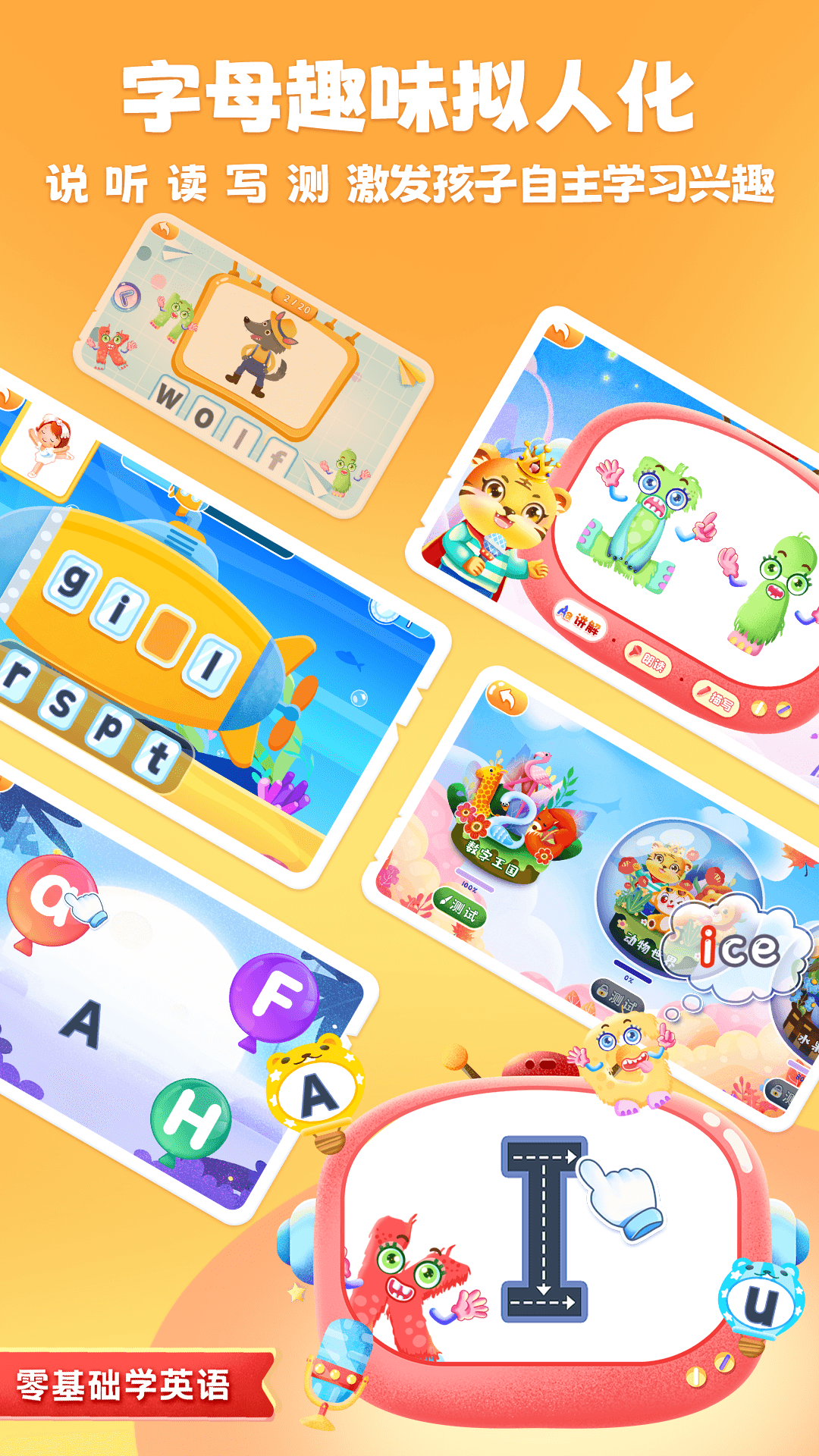 零基础学英语学英语字母ABC<br>趣味儿童早教英语启蒙,少儿学习英文字母ABC<br>益智趣味早教英文乐园,幼小衔接起码优选!快乐开启儿童英语启蒙之旅,轻松学习英语口语练习、英文启蒙,字母abc读写、自然拼读,单词拼读,字母歌,字母表。<br>【简介】儿童学英文字母专为学前儿童设计的早教英语启蒙课程,通过26个英文字母大小写的,英语早教启蒙,英语单词、儿童益智拼图的教学培养,注重亲子英语教学,为3岁,4岁,5岁 儿童快乐基础英语学习提供帮助。<br>【内容】课程包含 :<br>26个英文字母的读写<br>48个相关幼儿英语句式<br> 120个早教英语单词<br>自然拼读26个<br>英文儿歌36首<br> 字母表一个<br> 字母歌一首<br> 儿童益智拼图 26个<br> 幼儿园早教学习场景26个<br> 儿童趣味小游戏10个<br>【教学特色】:<br>* 早教英文字母学习,帮孩子自主完成启蒙英语教学。<br>* 结合幼儿园启蒙英语学习内容,帮助宝宝完成学前英语基础学习。<br>*26个字母小课堂:采用、听、写、讲解、可循环学习+场景互动方式让宝宝轻松掌握26个字母的大小写发音与书写。<br>*丰富互动,巩固记忆:个性定制小游戏,遵循记忆曲线设计,将知识融合进《字母潜艇》《儿童赛车》《打地鼠》《快乐字母捕鱼》等益智小游戏板块中,全方位训练加深孩子的英语字母认知,记忆,发音,拼读等能力。<br>*丰富配套教辅资源:精心设计卡片式单词学习:涵盖日常生活、数字、动物、水果、家庭成员、色彩、职业、学习工具等7个分类,96个常见单词,中英文相互切换,边学习边测试加深宝宝的记忆力丰富孩子词汇量。<br><br>【更多应用】<br>「儿童学汉字」为儿童设计的认字启蒙课程,包含所有认字基础学习,让孩子通过趣味的场景游戏爱上认字!<br>「儿童学拼音」为儿童设计的一站式拼音启蒙课程,快乐学习,解放家长!声母、韵母、音节、书写、拼读全覆盖!<br>「儿童学逻辑思维」为儿童设计的思维课程,通过进阶式课程提高幼儿解决问题能力,增进幼儿的学习挑战性,丰富幼儿的思维模式<br>「儿童学数学」为儿童设计的数学启蒙课程,包含所有数学基础学习,开发孩子对数字的认知,丰富数学概念, 让孩子通过趣味的场景游戏爱上数学!