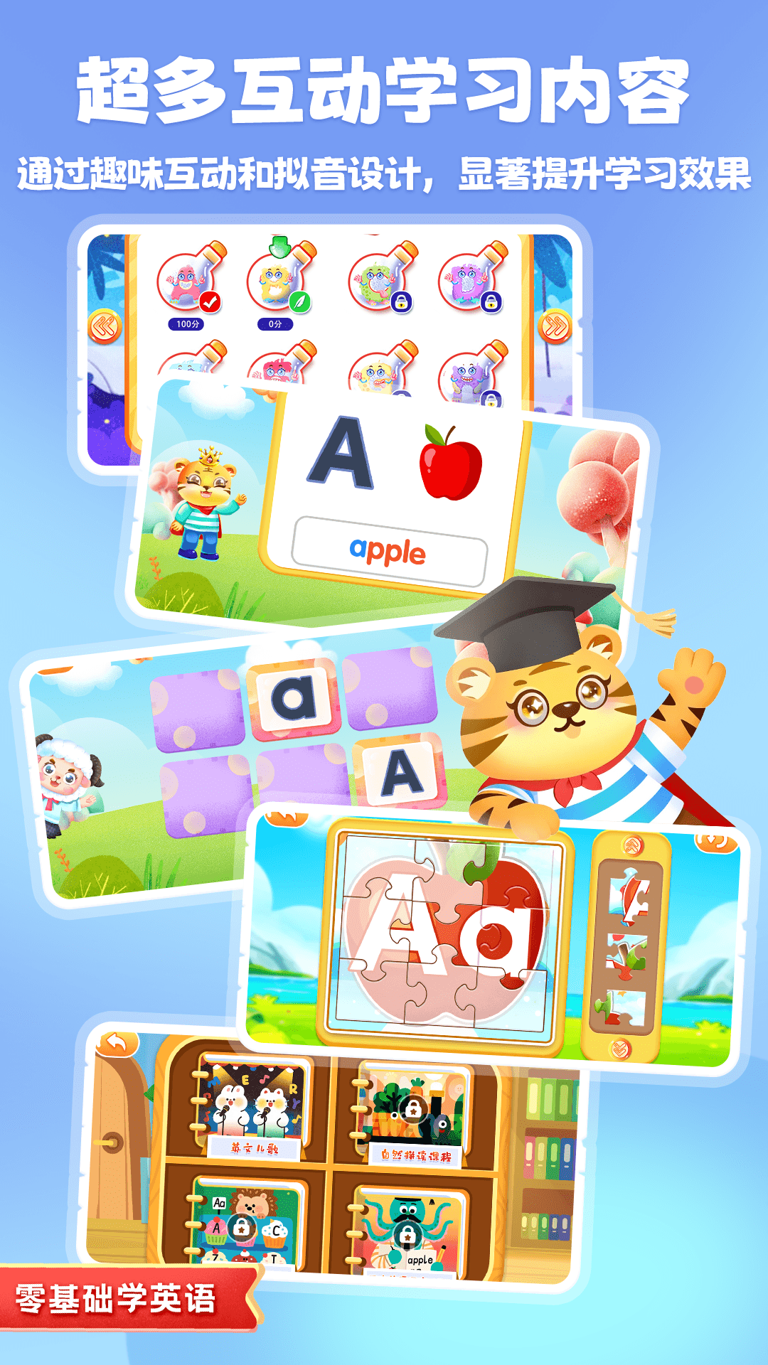 宝宝学英文字母是一款幼小衔接英语启蒙,轻松学会26英文字母和自然拼读的产品,宝宝在家就能边玩边学。 宝宝学英文字母专为学前儿童设计的早教英语启蒙课程,通过26个英文字母大小写的,英语早教启蒙,英语单词、通过趣味游戏进行教学内容巩固,注重亲子英语教学,为3岁至8岁 儿童进行快乐基础英语启蒙学习提供帮助。 幼儿英语启蒙早教英文乐园,幼小衔接少儿英语!快乐开启儿童英语启蒙之旅,轻松学习26个英文字母的读,写,听,英语口语练习、内容包括:少儿英语,儿童英语,英文启蒙,英语,字母,英文,英语字母,英文字母,自然拼读,单词拼读,字母歌,字母表。 【内容】课程包含 : 26个英文字母的读写听自然拼读,52个相关单词的拼读,48个相关启蒙英语句式, 120个早教英语单词,自然拼读26个,英文儿歌36首,字母表一个,字母歌一首,儿童益智拼图 26个,幼儿园早教学习场景26个,儿童趣味小游戏10个。 【教学特色】: 【专业领域的研发团队,匠心研发】 -覆盖教育学、心理学背景的研发团队; -幼儿早教英文字母学习必备,帮孩子自主完成幼儿英语启蒙教学。