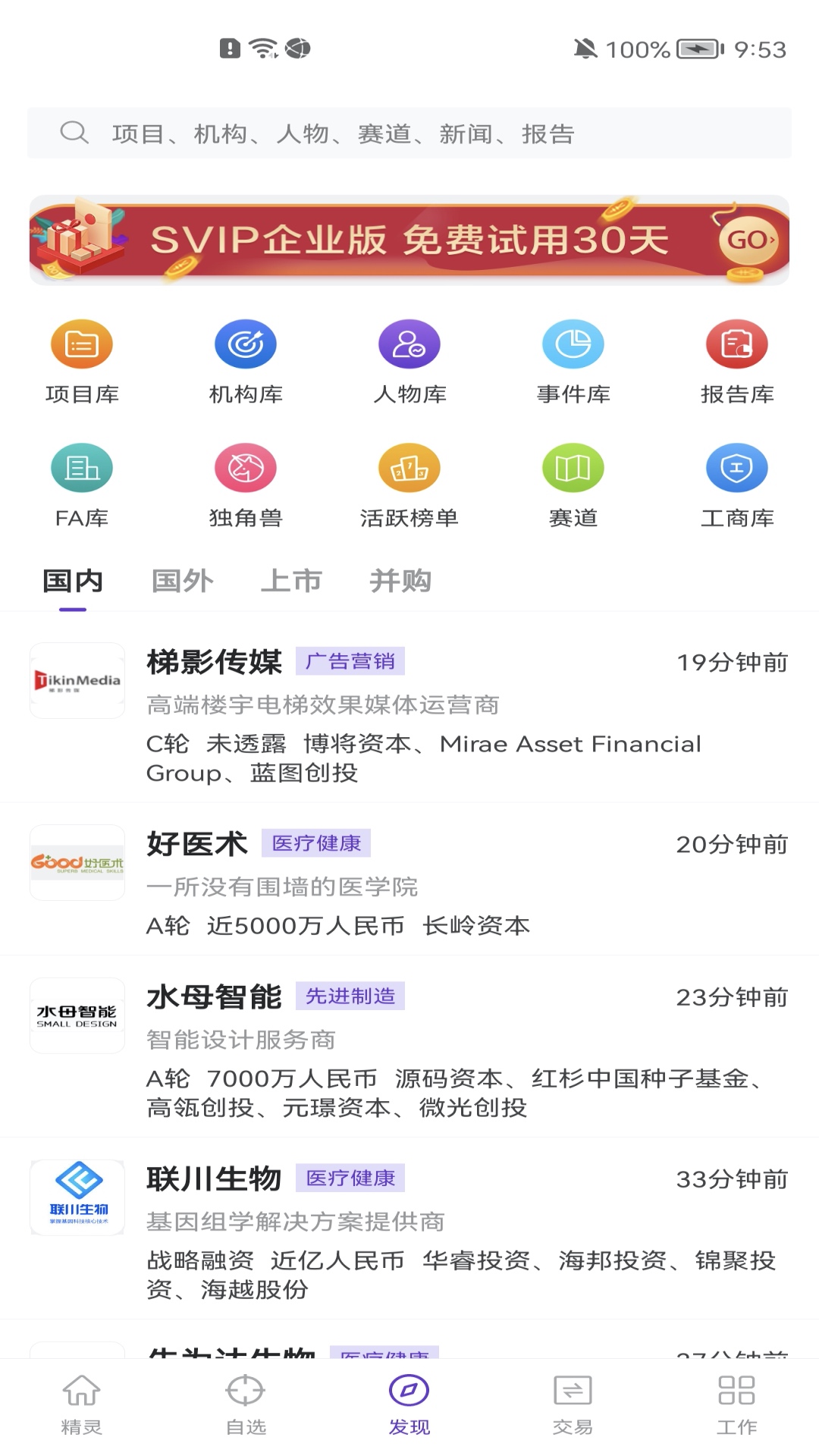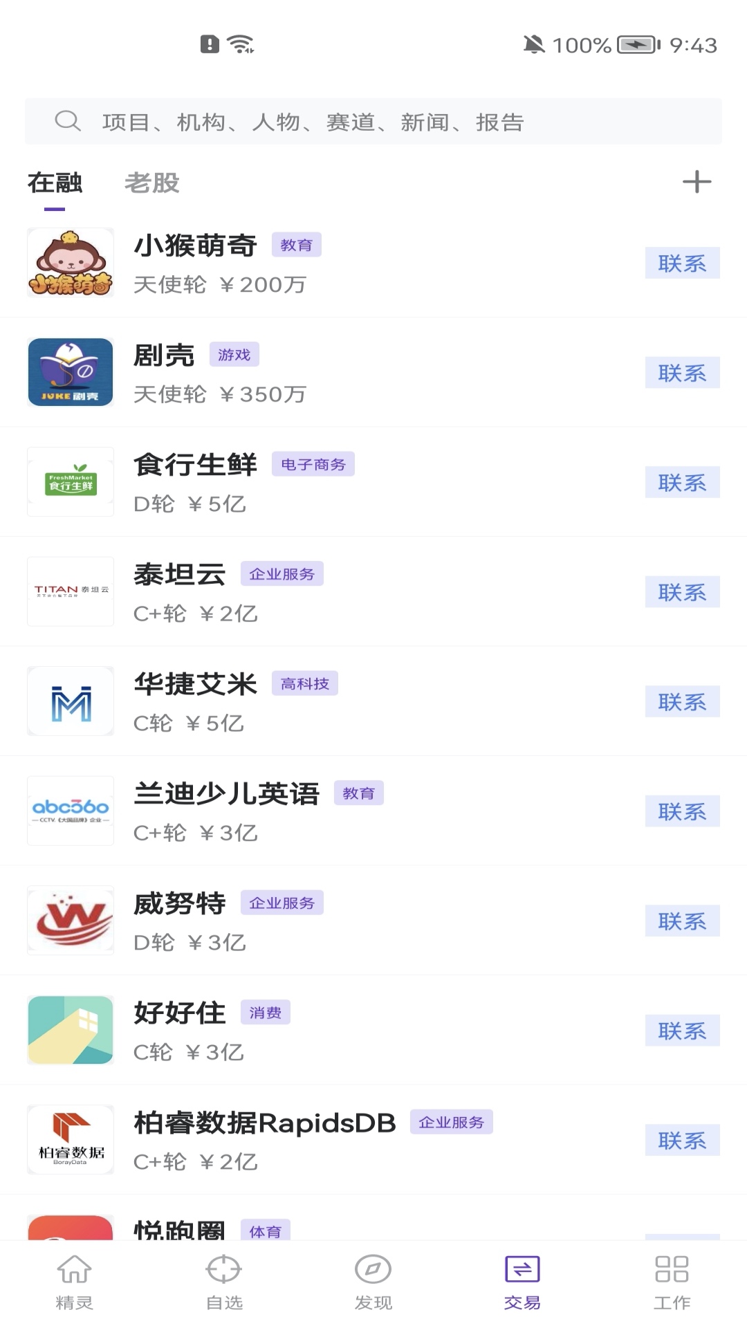 精灵APP是投融资大数据服务平台,以投融资行业大数据和AI智能技术为驱动,为创业项目方与投资方提供一站式大数据服务。精灵数据已入驻VC/PE投资机构10w+、活跃投资人2w+、优质创业项目60w+。<br><br><br>【产品特点】<br><br>1、并购:线索交易、并购事件、并购资讯、并购数据;<br><br>2、资讯:实时更新创投行资讯,准确关联项目、机构、人物,并为每位用户个性化推荐内容;<br><br>3、数据:投资机构10w+、活跃投资人1w+、优质创业项目60w+、报告100w+、资讯200w+;<br><br>4、人脉:快速获取最新投资人信息并关注,实时获取投资人最新动态并在线沟通畅聊;<br><br>5、追踪:快速追踪项目和机构,实时获取项目和机构相关的事件、资讯、报告等动态。<br><br><br>【联系我们】<br><br>官 网:https://www.jinglingshuju.com<br><br>邮 箱:admin@jinglingshuju.com<br><br>微 信:geniedata