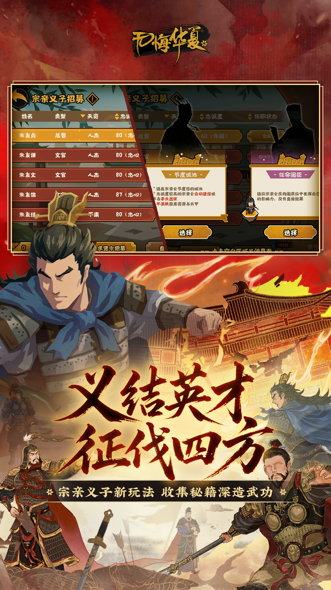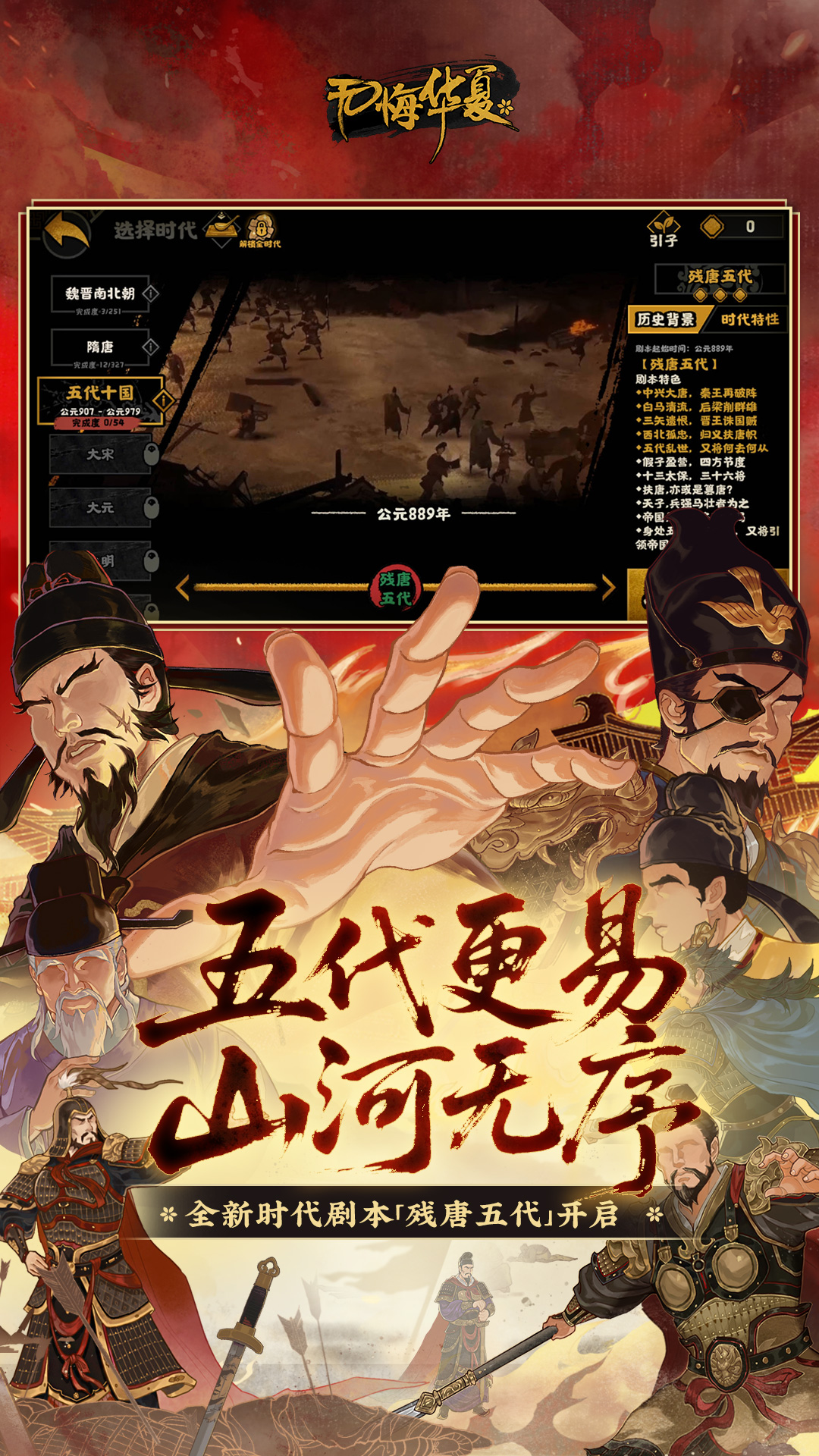 《无悔华夏》四周年钜献!全新主时代五代十国剧本《残唐五代》现已开启! 可体验梁、晋、残唐、吴越、归义军等13+全新五代势力。冯道、周德威、李存孝、王朴等全新16位时代名臣登场!全新义子宗亲系统、时局阵营玩法等开放,你将在繁荣与危机间抉择天下命运——是走向武夫当国,还是迎来太平治世?庆典福利奉上,登录可领天材名臣、华服厚礼! ———————————— 《无悔华夏》是一款华夏五千年历史背景设定的策略手游。 主线剧本现已更新三皇五帝、夏商周、春秋战国、秦楚汉、大汉、汉末三国、魏晋南北朝、隋唐、五代十国;分支剧本已更新成汤伐桀、春秋、三家分晋、吴楚越、横扫六合、班超守西域、诸侯讨董、三国鼎立、高平陵之变、南北归一、五单于争立、汉与罗马、楚汉争霸、隋末乱世、安史之乱;战役已更新涿鹿之战、长平之战、韩信北伐、河西之战、昆阳之战、淝水之战、河西归唐;以及人物传记玩法《张骞传》、《孔子传》、《玄奘传》等 【这里有千年的故事】多朝剧本时代画卷 【这里有百种的人生】君主扮演多样结局 【这里有彪炳的人物】招募名臣政策辅佐 【这里有酣畅的战役】即时微操策略之战