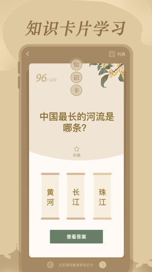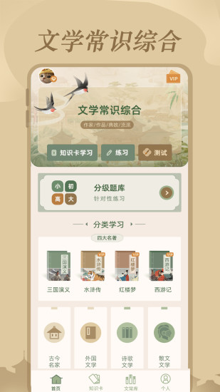文学常识是一款对国内外古今文学常识做综合练习的软件,目的是为了提高用户对国内外文学常识的掌握能力。 【产品特色】 1、知识卡学习:知识能量卡的设计更适合亲子互动,朋友聚会,在玩耍中学习文化常识,丰富认知,增强智力,训练快速思考能力,提升认知能力,学习玩耍两不误。 2、巩固练习:本软件对文学常识做了多个分类:四大名著、古今名家、民间故事、古代文化、外国文学、诗歌文学、小说文学、戏曲文学、散文文学等,可以帮助用户更好更清楚的对各方面的文学常识进行针对性练习。 3、自我检测:各分类都有对应的自我检测,限时练习,检测用户对常识的掌握情况。 4、分级题库:针对不同阶段增设对应题库练习,帮助用户更好理解当前文常知识。 【文常库】 文常库对文学常识中的一些内容做了四大分类:古今名家、传统文化、数字文学、外国作家,梳理了对应的文常知识点,方便闲暇之余温习知识点。 【其他功能】 1、收藏本:用户可以将自己想要反复练习的常识和较难的常识收藏,方便更好的掌握; 2、错题本:练习过程中答错的题目会自动进入错题本,方便用户巩固练习; 3、打印功能:打印题目后做笔试训练,可以脱离电子屏幕,让练习更加严肃。