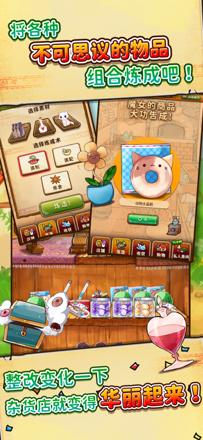 制作奇妙杂货商品,赚钱,重振店铺! ■故事背景 “大魔女去世” 受父母所托继承接管魔女杂货店。 初来小镇,陌生的人群。 四周仍旧充满生活气息,却也隐藏着对魔女去世的不安。 进入杂货店一看,店内已经荒废破旧。 转身向门正要离去,却见一个男孩正向店内张望。 “请问小姐姐是新魔女吗?你卖魔女饼干吗?” 魔女,至幼崇拜向往的魔女! 此刻,或许就是传说中的那梦想成真的一刻吧! ■游戏方法 到森林湖泊等地是收集素材,按照神秘秘方调配炼造,制作各种各样奇妙杂货项目。 在小镇的商店街可以买到需要的素材,各种秘方或工具,以帮助你扩充设备,强化机能,增加收益。 根据小镇人们的心声或评论,所卖商品也会有所改变。 紧跟流行趋势,努力打造人人都喜爱的魔女杂货店吧! ■建议玩家人群 .喜爱可爱主题的人 .空闲时想打发时间的人 .喜欢踏实前进的人 .想成为魔女的人