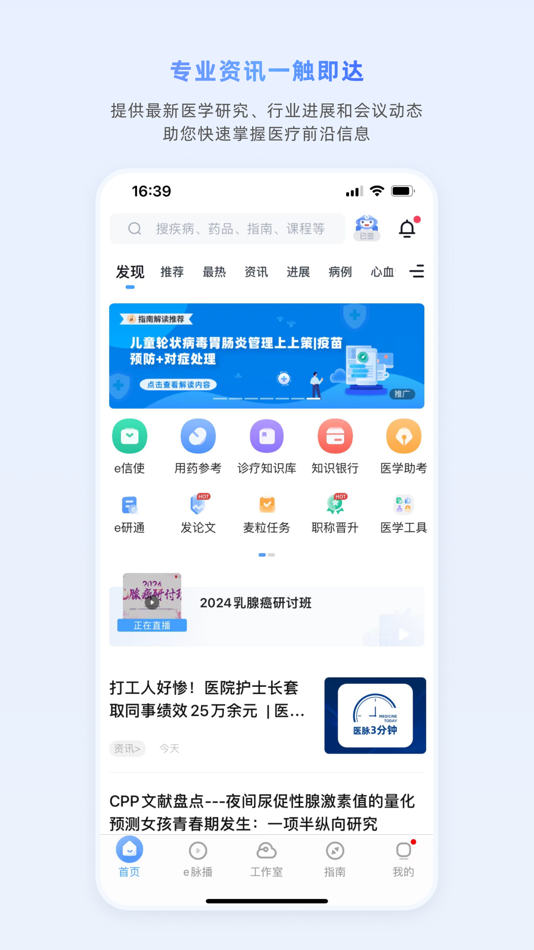 医脉通,汇集医学资讯,最新医疗进展,指南用药信息的聚合内容平台。 临床指南、病例讨论、合理用药、考试晋升、医学课程、医学会议、医患问答、科研投稿、论文润色… 医疗领域内容全面覆盖,专业医学团队支持内容生产。 核心医学版块: 【医学资讯】 网罗时下医学圈内热门医学资讯,全新学术进展,医疗政策,助力医务工作者获取内容信息。 【指南用药】 指南:万份医学指南,解读,翻译,一站式检索,支持PDF分享及下载; 用药:30000份原版药品说明书,涵盖中药西药的用法用量、安全用药、药理毒理等,并持续更新用药经验,决策更安全。是医生,医学生的临床助手,用药助手。 【病例及医学课程】 疾病诊疗方法、科室典型病例,疑难病例在线分享,临床医生讨论教学指导,医生社群辅助学习。 【考试晋升】 医考题库、医考视频、重点难点解析一网打尽。 【科研投稿】 期刊选择、论文润色、翻译……助你科研一臂之力。 医脉通旗下产品包含「临床指南」「医脉通」「全医药学大词典」 「用药参考」,一次注册全部通用。 医脉通微信公众号:医脉通 小程序:医脉通 医脉通电话:010-64405225 医脉通网址:http://www.medlive.cn/