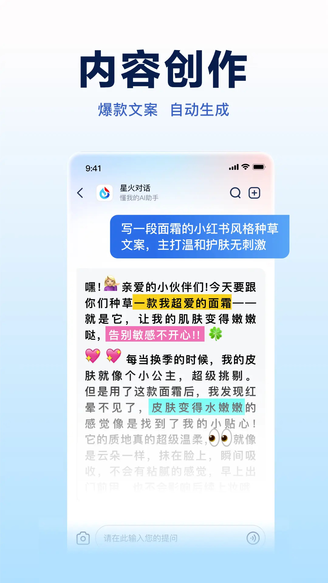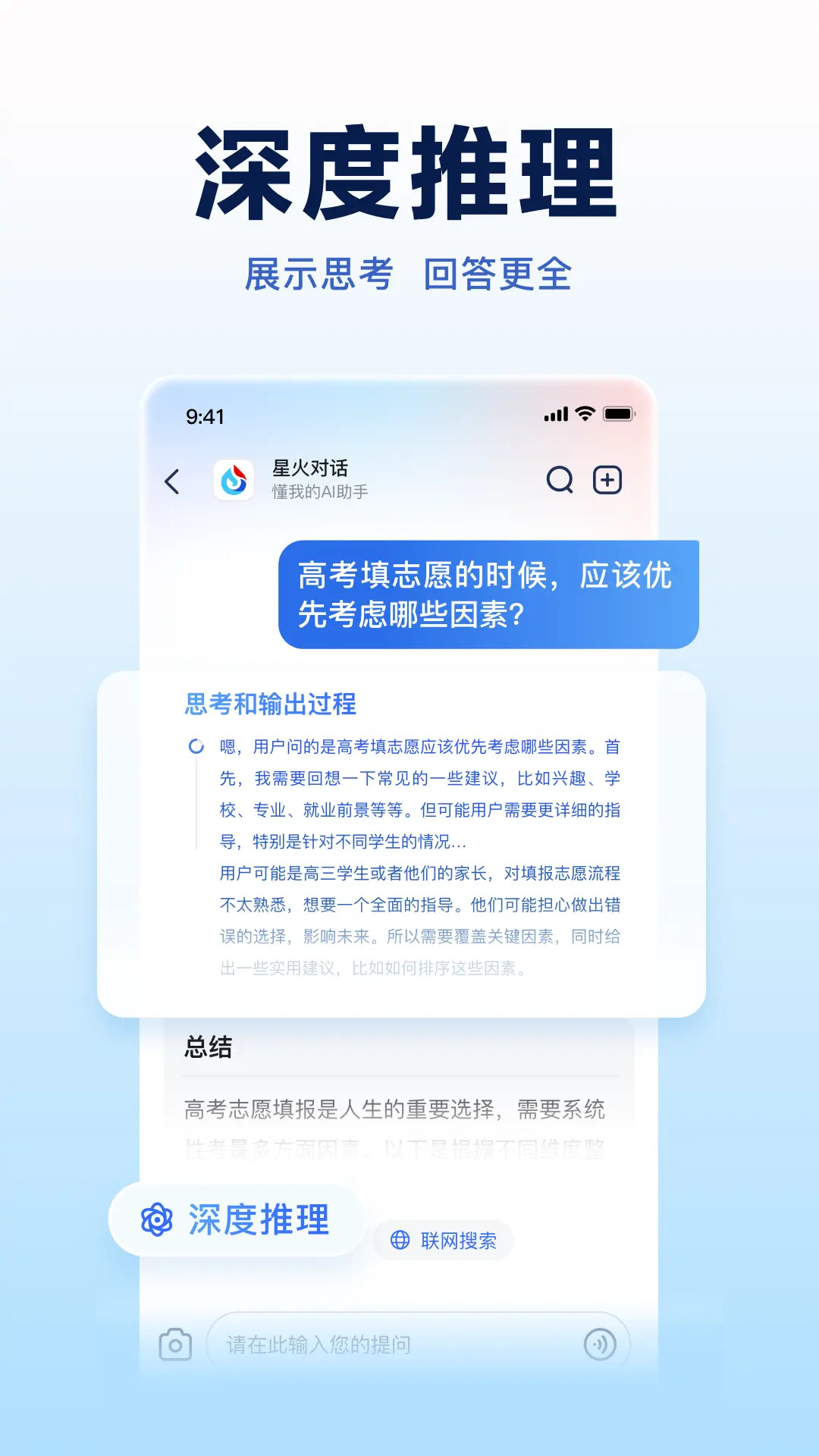 讯飞星火是更懂你的AI助手,能够为你完成“深度推理、文案创作、图片生成、AI搜索、数据分析、智能翻译、代码编程”等。全新升级的星火X1,可以按步骤拆解复杂问题,完整展示思考过程,同时结合联网搜索,让回答更具实时性和全面性。 功能亮点: 【深度推理 逻辑清晰】 -具备强大的自主思考规划能力,能够轻松处理数学、编程等复杂任务,如同学霸一样头脑清晰、思维缜密。 -根据要求可调用联网搜索、代码解释器、图片理解等工具,回复内容更丰富。 【内容写作 一键搞定】 -日报周报、营销策划方案、视频脚本、爆款文案、新闻稿,任何文案写作类型都能一键搞定,为你提供灵感、辅助创作。 -年度汇报、策划方案、总结发言、团队分享,不论多复杂的PPT方案,讯飞星火也能胜任,一键生成结构清晰、模板精美的PPT。 【百变智能体 随时调用】 -6.3w+个公开智能体,一个指令帮你轻松搞定年终总结、制作PPT、优化简历、写代码、写文案、制定旅游攻略等。 -讯飞智文、晓知、讯飞语伴、星火合同助手等十多个星火轻应用,面向不同垂直场景,解决更多刚需问题。 【AI搜索 秒级触达】 -实时汇聚搜索权威内容,精准提炼整合结果,内容可溯源。 -支持深度搜索模式,提供更结构化、更丰富回答,帮助用户全方位了解搜索内容。 【文档解读 高效总结】 -Word、PPT、PDF、Excel、链接、图片与音视频等多格式文档一键上传管理,打造你的私域知识库。 -支持对文件进行速读解析、总结提炼、润色改写、一键生成PPT、文档翻译等操作。 【图片视频 自由创作】 -电影写真、儿童绘画、赛博朋克、水彩画、3D动漫、二次元,轻松生成多种风格图片。 -不仅能生成图片,讯飞星火还可定制虚拟人视频,在每个节日为亲友送去特别的祝福。 【全语音交互 畅快问答】 -搭载星火超拟人极速交互,多种情感、风格、方言随意切换,拥有百变人设。 -响应速度更快,可自由打断,能感知你的喜怒哀乐,提供满满的情绪价值。 --联系我们-- 如果您在使用讯飞星火中有任何问题,可在“设置—意见反馈”中进行反馈。也可以通过以下方式联系我们: 微信公众号:讯飞开放平台 官方网站:https://xinghuo.xfyun.cn